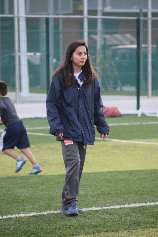 La maestra Génesis enseñaba a sus peques a conducir el balón frente a varios obstáculos, mientras que Lírce les mostraba como definir frente a la portería.
