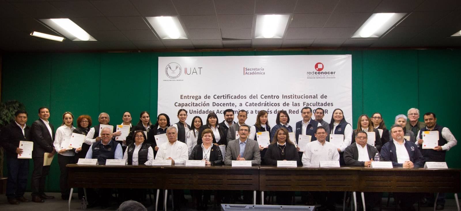 El máximo directivo universitario felicitó a los maestros y maestras que obtuvieron la certificación en los estándares del Consejo Nacional de Normalización y Certificación de Competencias Laborales (CONOCER), tras ser capacitados a través del Centro Institucional de Capacitación Docente de la UAT.