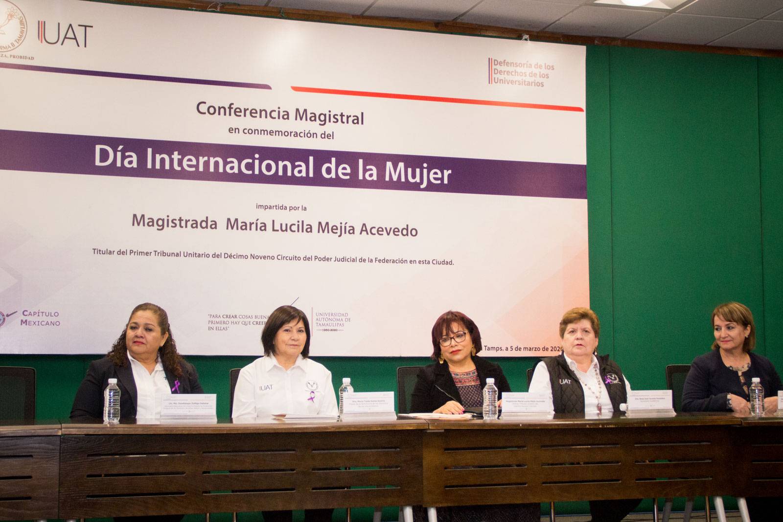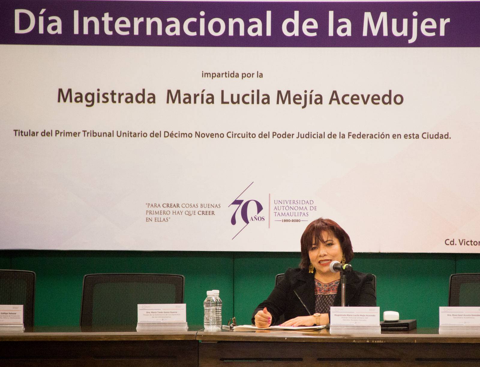 La Universidad Autónoma de Tamaulipas (UAT) a través de la Defensoría de los Derechos de los Universitarios, llevó a cabo la Conferencia Magistral en Conmemoración al Día Internacional de la Mujer, impartida por la Magistrada María Lucila Mejía Acevedo, Titular del Primer Tribunal Unitario del Décimo Noveno Circuito del Poder Judicial de la Federación en Ciudad Victoria.