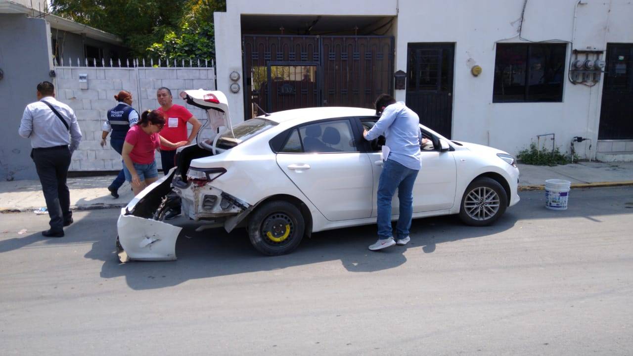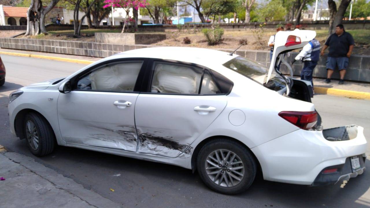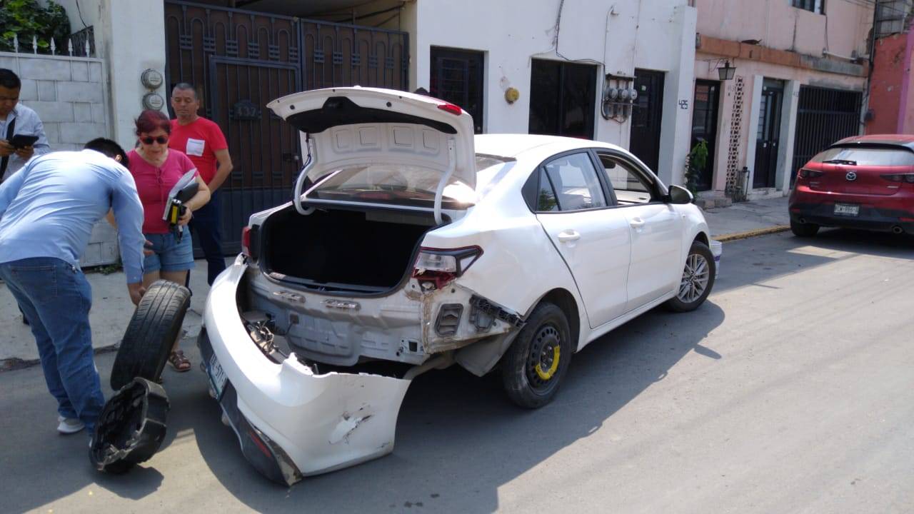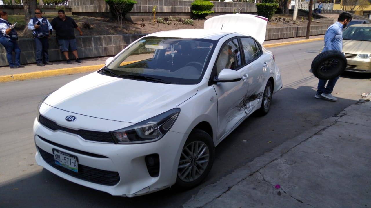 Al ser impactado el automóvil Río sale proyectado y se estrelló contra el cordón de la banqueta dejando como saldo cuantiosos daños materiales.