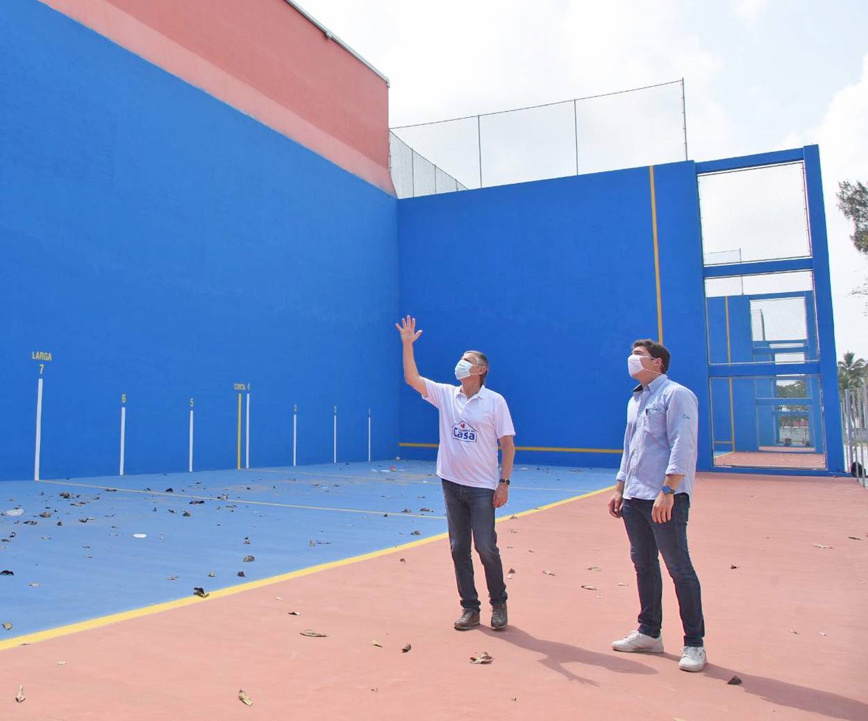 Acompañado por el titular de la Secretaría de Bienestar Social y Deportes, René Sentíes Barrios, el Jefe edilicio destacó que atendiendo las disposiciones sanitarias y de sana distancia recomendadas por el Comité Estatal de Seguridad en Salud, los trabajos de mejora en las siete canchas de frontón, así como la instalación de un moderno campo de futbol, se realizan conforme a lo previsto.