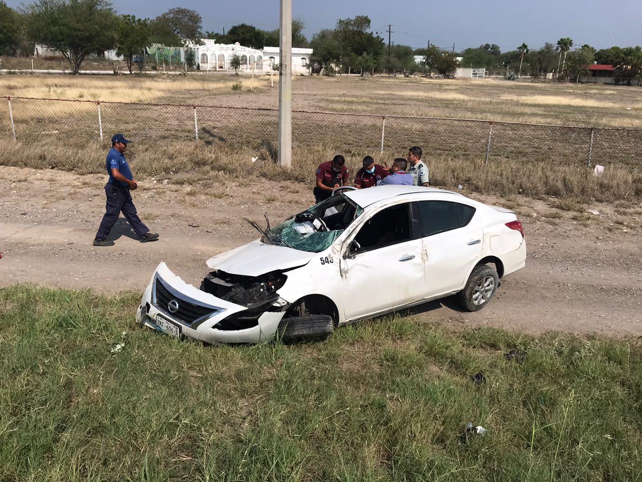 Tras chocar contra otro vehículo, salvándose de morir, el conductor de un automóvil Nissan quedó volcado cuando se dirigía a Reynosa.
