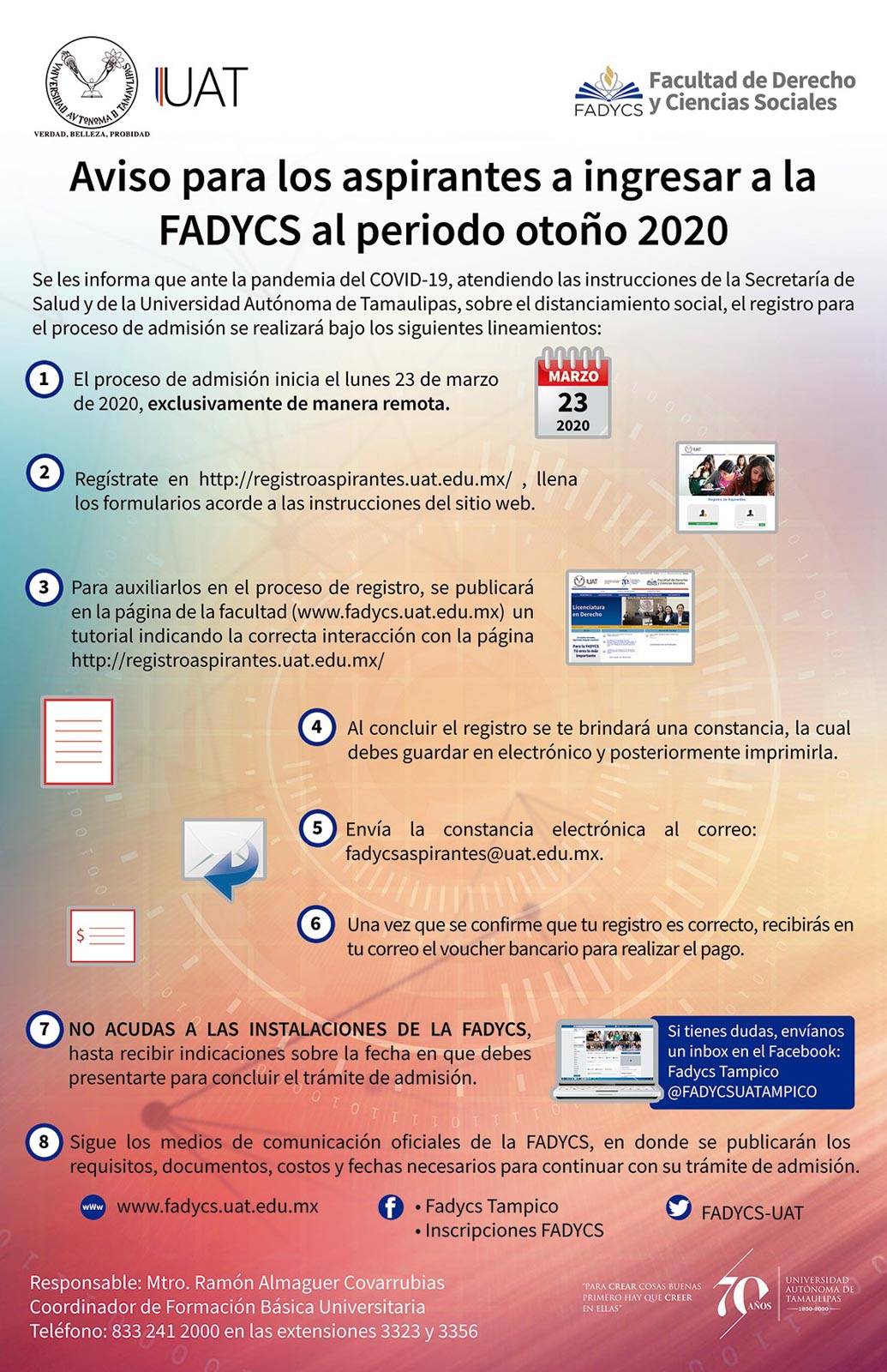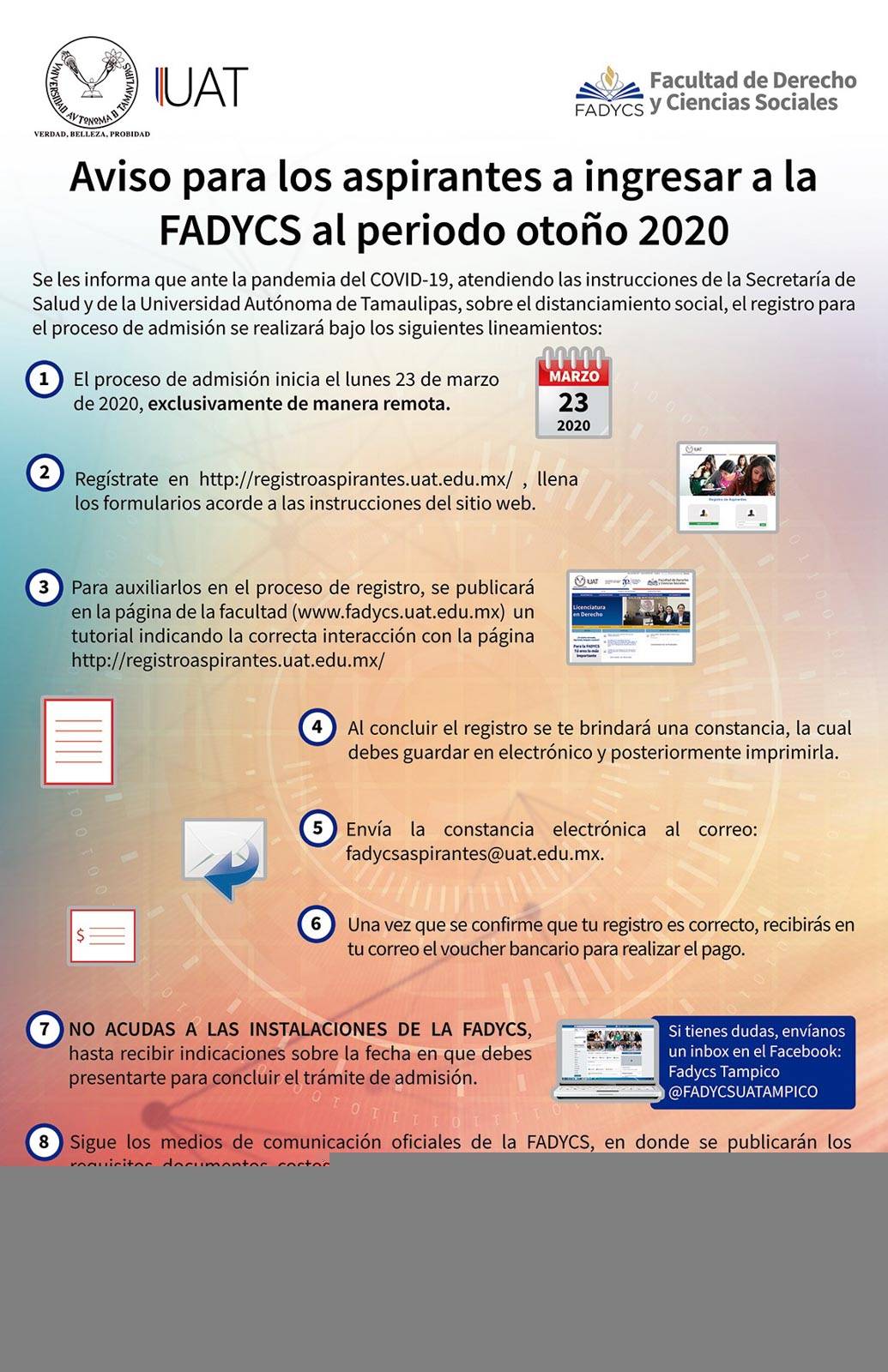 Es importante que los aspirantes no acudan a las instalaciones y que estén al tanto del portal www.fadycs.uat.edu.mx y de las redes sociales, en Facebook: Fadycs Tampico o Inscripciones FADYCS, pues mediante estos medios se dará más información sobre requisitos, documentos, costos y fechas para continuar con el trámite de admisión.