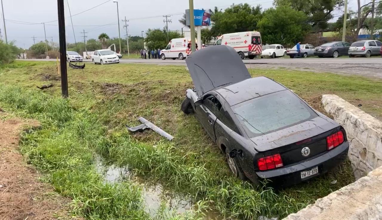 Manejar a exceso de velocidad con pavimento mojado salió caro al empleado de una empresa refresquera ya que cayó con su automóvil Mustang a un canal.