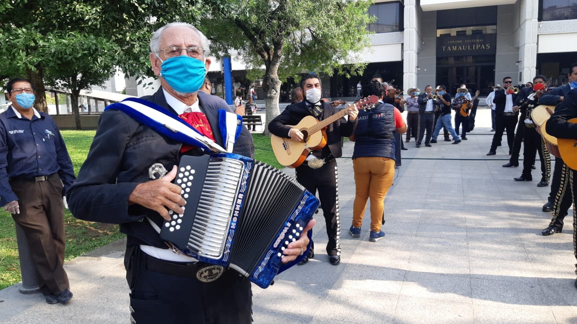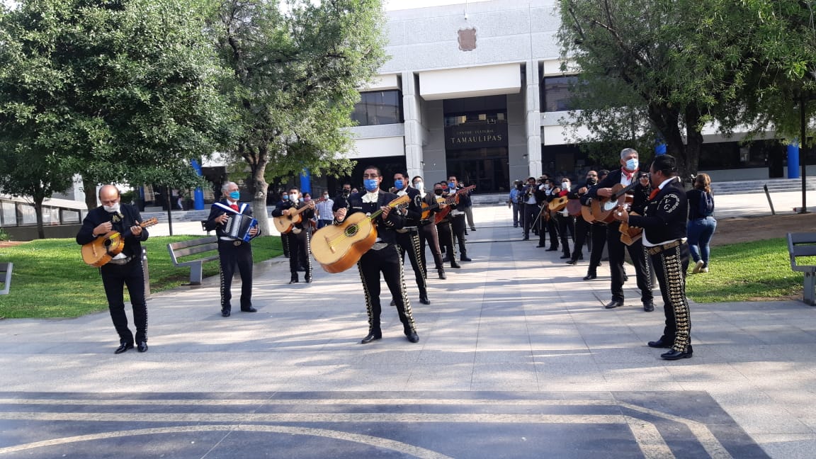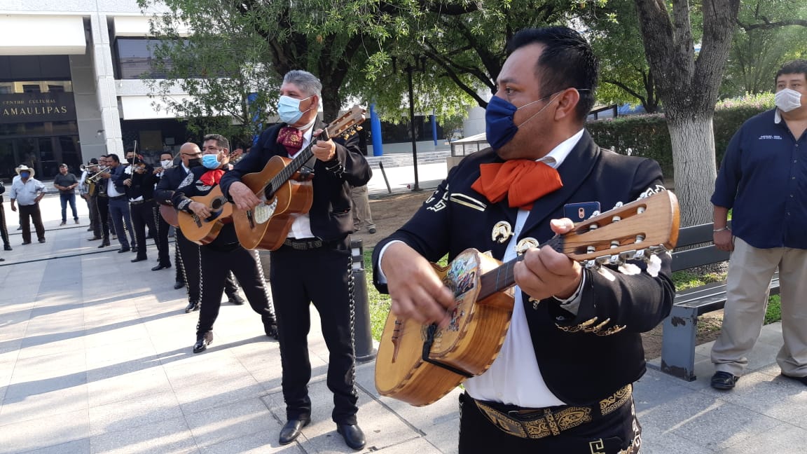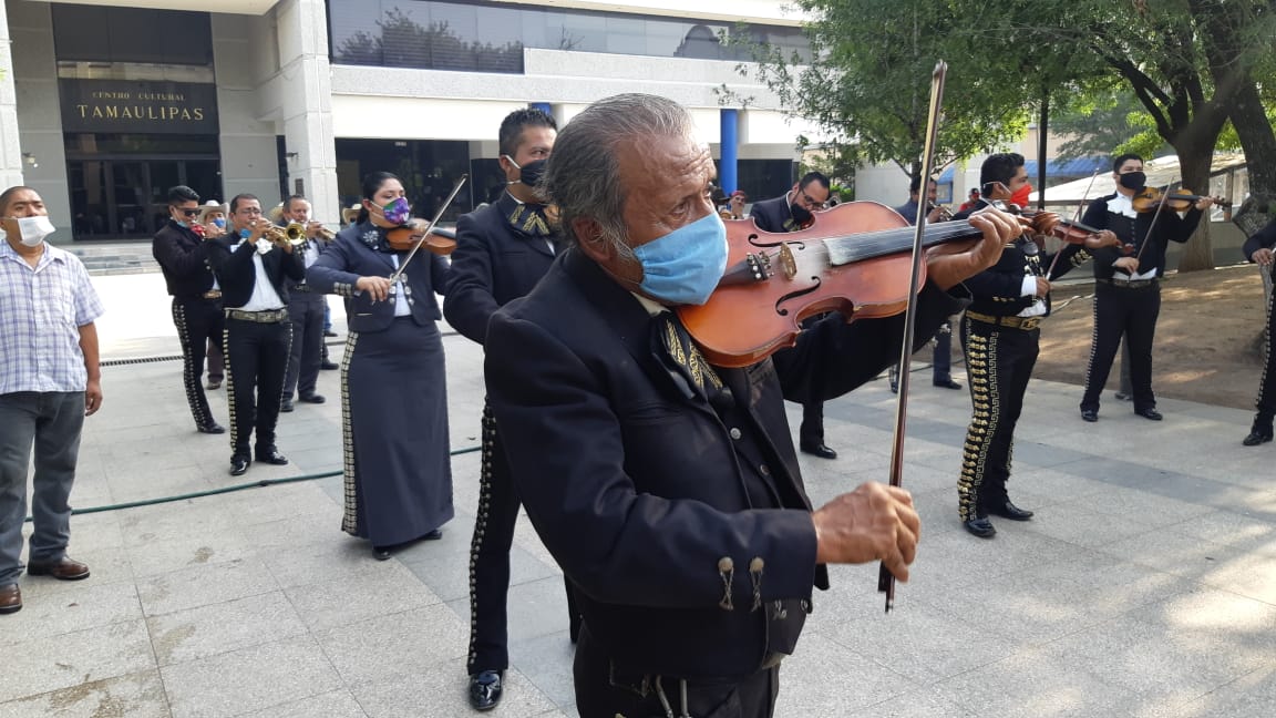 Al son del mariachi, miembros del Sindicato de Músicos de Victoria y la región acudieron a Palacio de Gobierno a solicitar apoyos para enfrentar la crisis económica por la que atraviesan al ver suspendidas sus actividades por la pandemia del covid-19 .