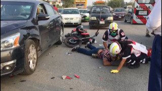 Tras impactarse contra el automóvil, el cual reanudaba su marcha al marcarle el semáforo la luz verde, el motociclista salió proyectado y cae al suelo resultando con heridas de consideración.
