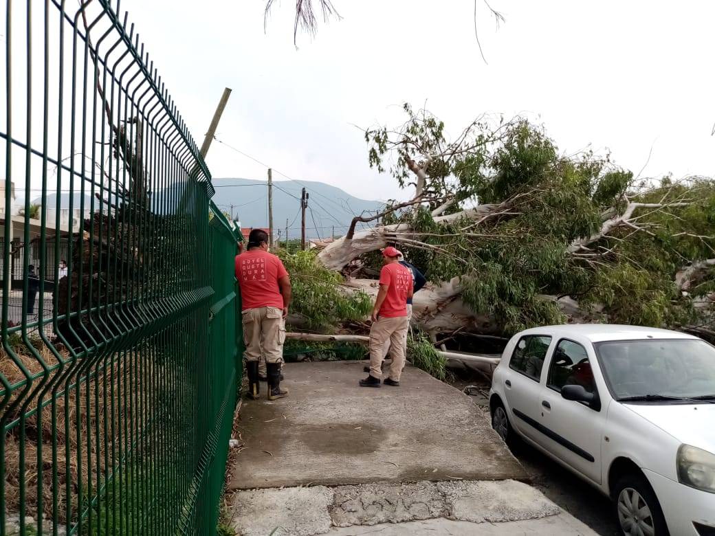 Tremendo susto se llevaron vecinos de la calle 9 y 10 Julián de la Cerda al escuchar tremendo estruendo tras la caída de un viejo eucalipto gigante que se llevó la barda perimetral de un Cendi y de paso los cables de energía eléctrica de un poste de la CFE.