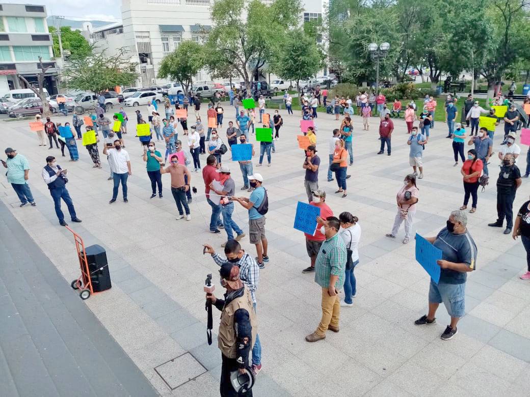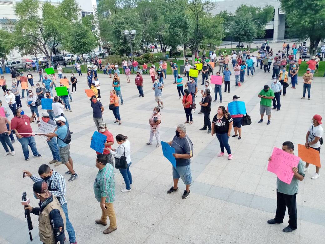 Cientos de comerciantes comenzaron la caminata desde la calle Ocho Hidalgo hasta el 15 con cartulinas en mano que decían, "Queremos un apoyo para poder quedarnos en casa".