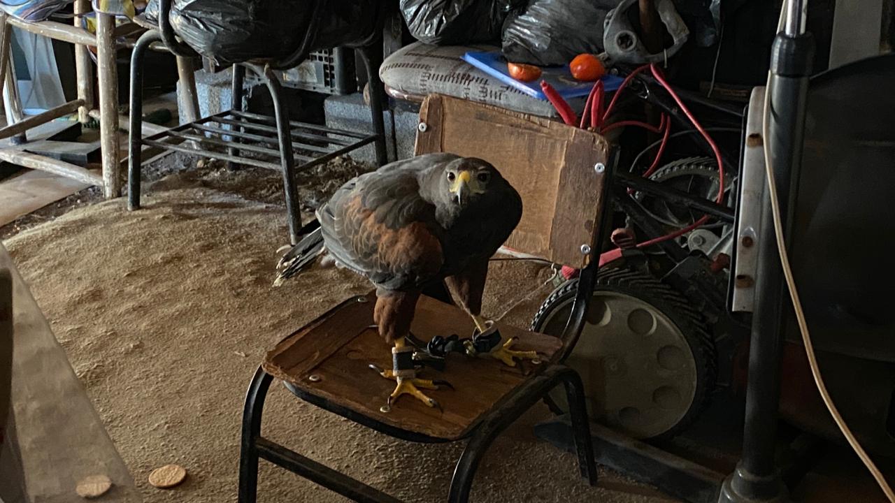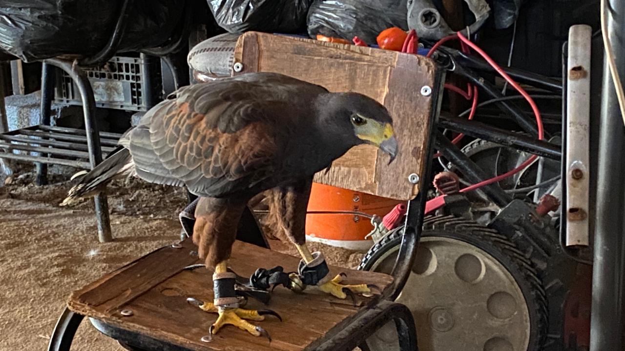El águila real presenta un arnés colocado en ambas patas y unas argollas metálicas.