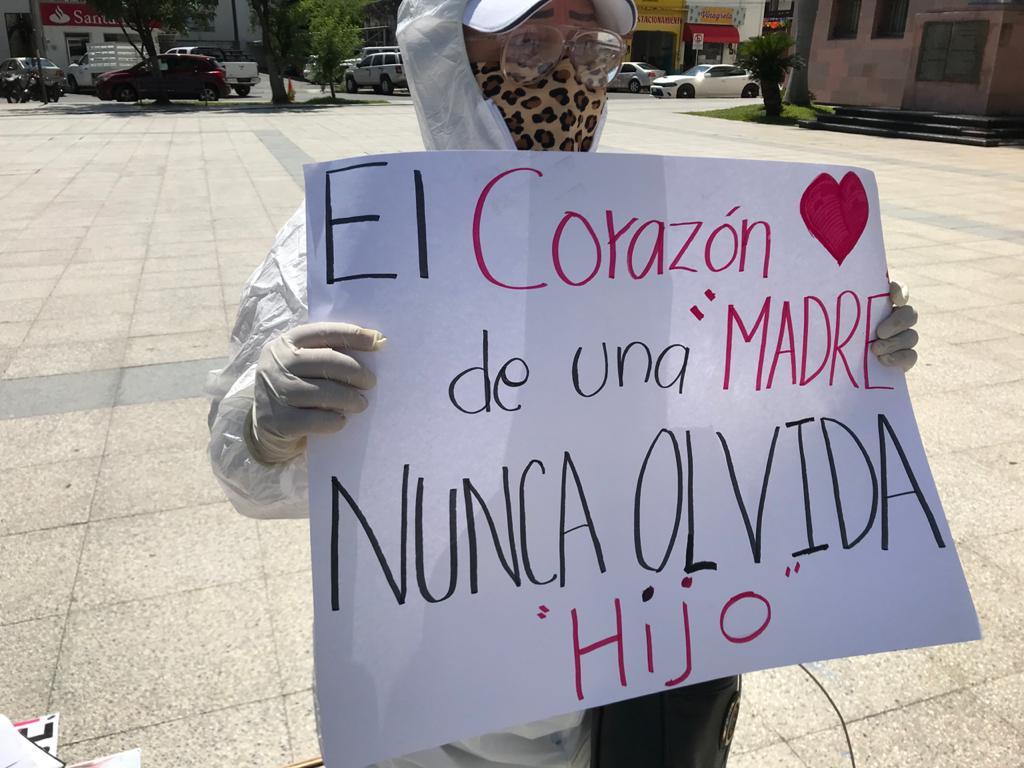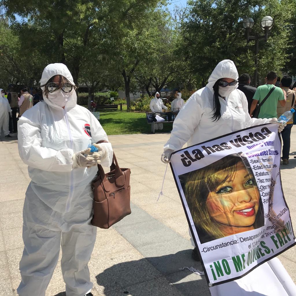 Vestidas con los monos, cubrebocas, guantes, googles y demás que usan en sus labores de búsqueda las madres se manifestaron frente al Palacio de Gobierno para exigir la continuación de los trabajos y se cumplan con los compromisos contraídos por el Instituto de Atención a Víctimas del Delito.