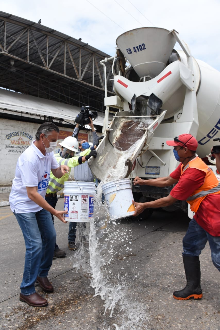 La jornada sanitizante para contener la propagación del Covid-19 fue posible gracias a la donación hecha por CEMEX México de un efectivo producto germicida, mismo que fue transportado a través de sus camiones revolvedores y aplicado en las vialidades que confluyen a la zona de los mercados, así como en pasillos y locales comerciales ubicados en el interior de los mismos.