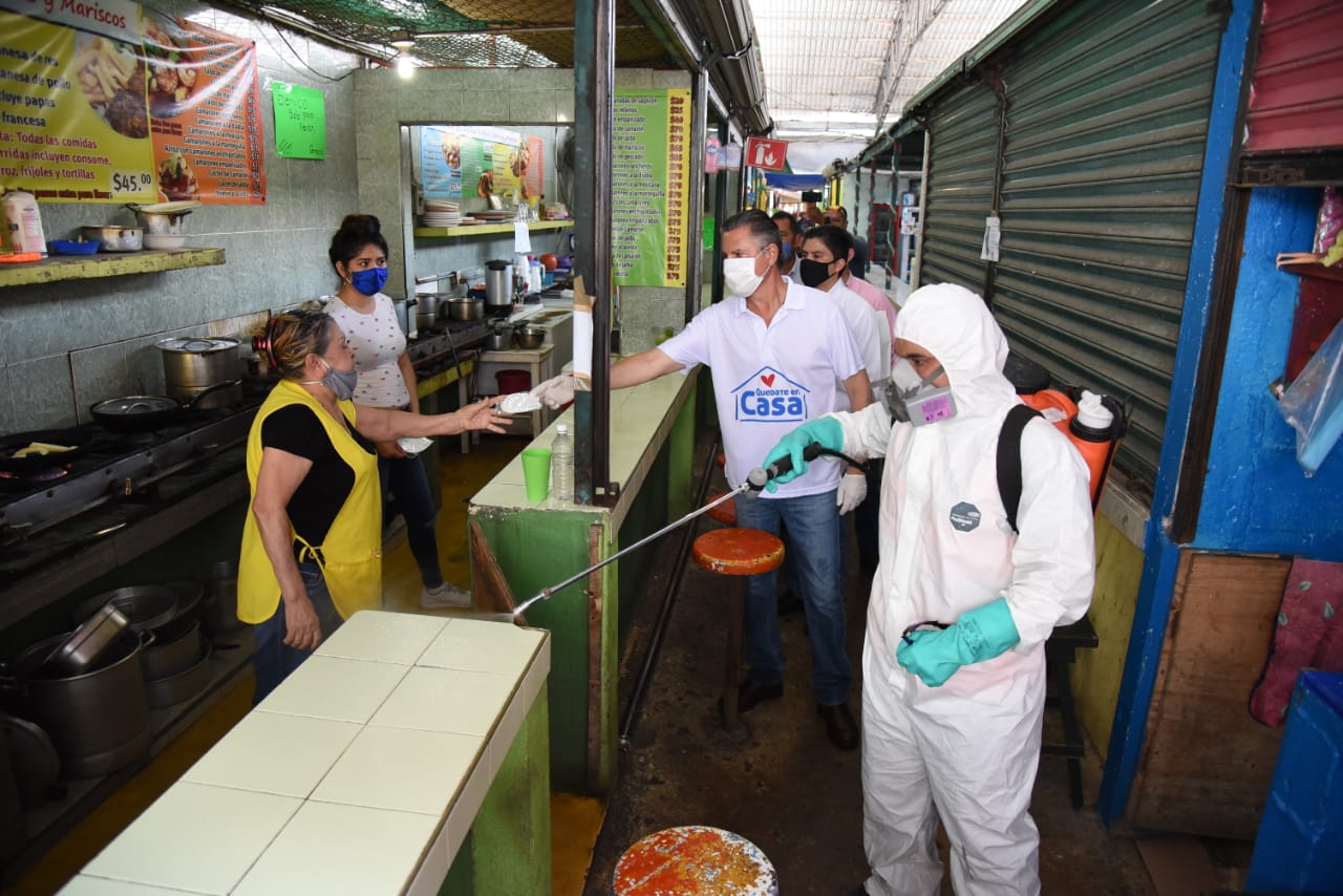 El Presidente Municipal Chucho Nader encabezó este miércoles los trabajos de sanitización en el entorno e interior de los mercados temporales y del mercado Francisco I. Madero con el fin de brindar protección sanitaria a los comerciantes y a la población que acude a estos centros de abasto.