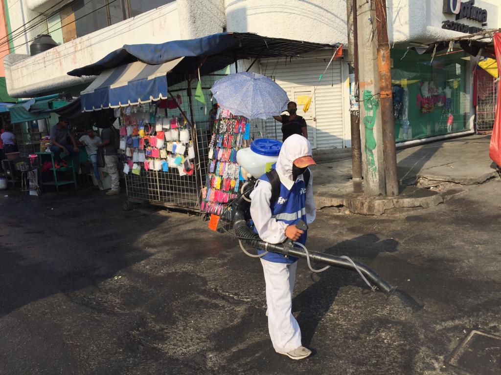 Cabe señalar que de manera simultánea personal del Ayuntamiento llevó a cabo un operativo de sanitización en donde cuatro empleados con aspersores tipo mochila rociaron con material sanitizante espacios públicos como la calle Siete de bulevar Praxedis Balboa hasta la calle Morelos así como los locales ubicados alrededor y dentro del mercado Argüelles.