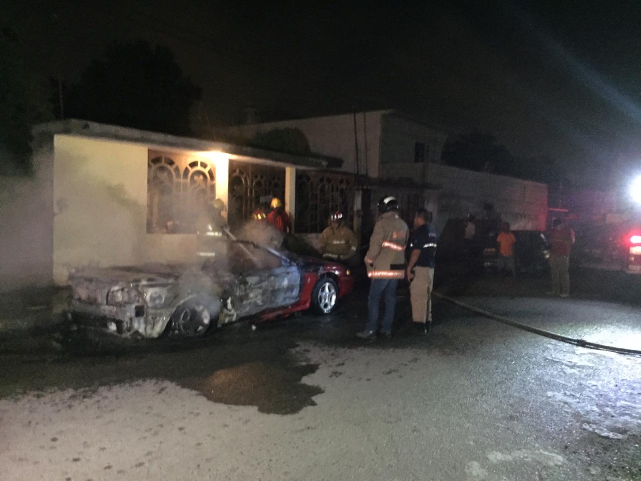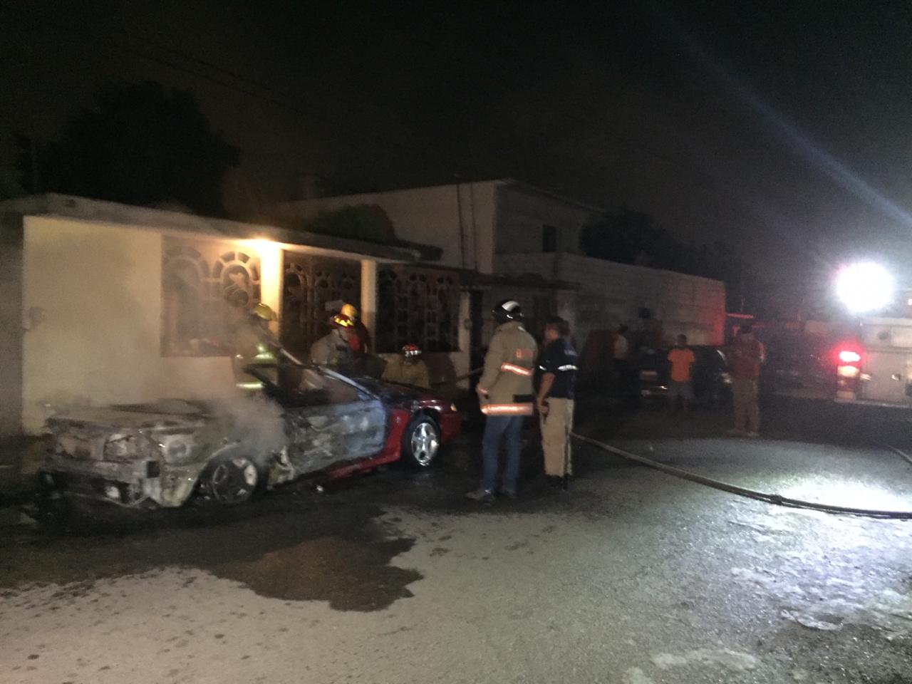 A consecuencia presuntamente de un cortocircuito, solo fierros humeantes quedaron de un automóvil deportivo después de ser consumido por un incendio.