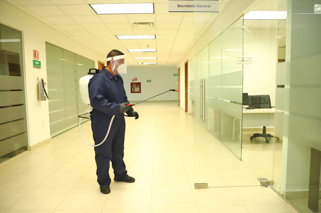 La sanitización se llevó a cabo este domingo, en todas las áreas del Congreso; oficinas, pasillos, baños, área de prensa, salas de comisiones, recinto, entre otras, y se continuará con las medidas de limpieza y desinfección los cuales se han llevado a cabo en estos meses.
