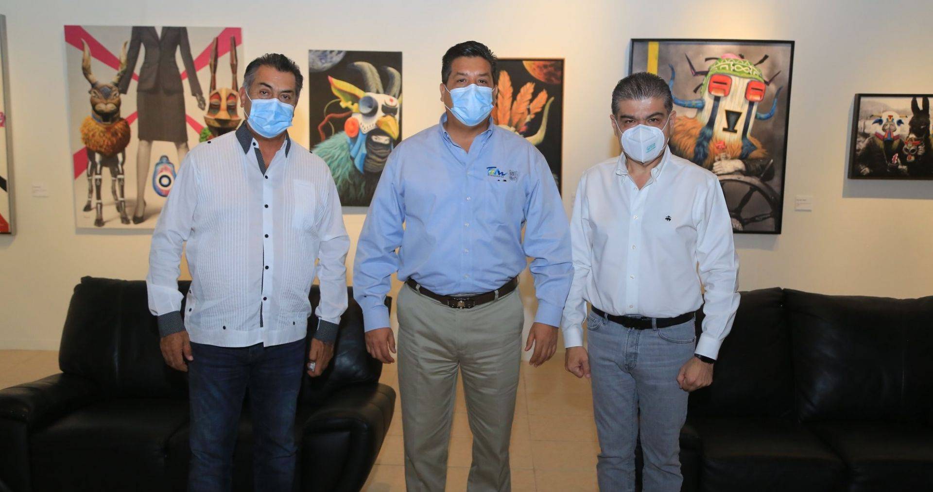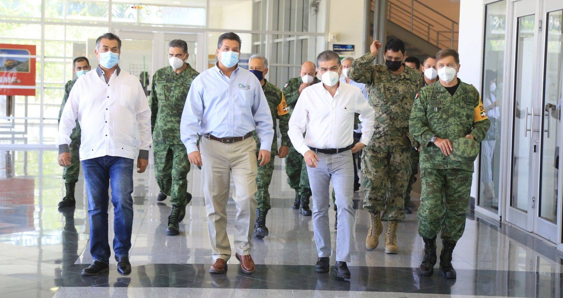 Los gobernadores Miguel Angel Riquelme Solis; Coahuila; Jaime Rodríguez Calderón, Nuevo León y Francisco García Cabeza de Vaca junto al general Jens Pedro Lohmann Iturburu, comandante de la 4/a. Región Militar y el general Arturo Pancardo Escudero, comandante de la 8/a Zona Militar; el comandante de la Primera Zona Naval, Flavio del Angel García así como mandos de la Guardia Nacional y funcionarios de la Fiscalía General de la República celebran una reunión en Nuevo Laredo.