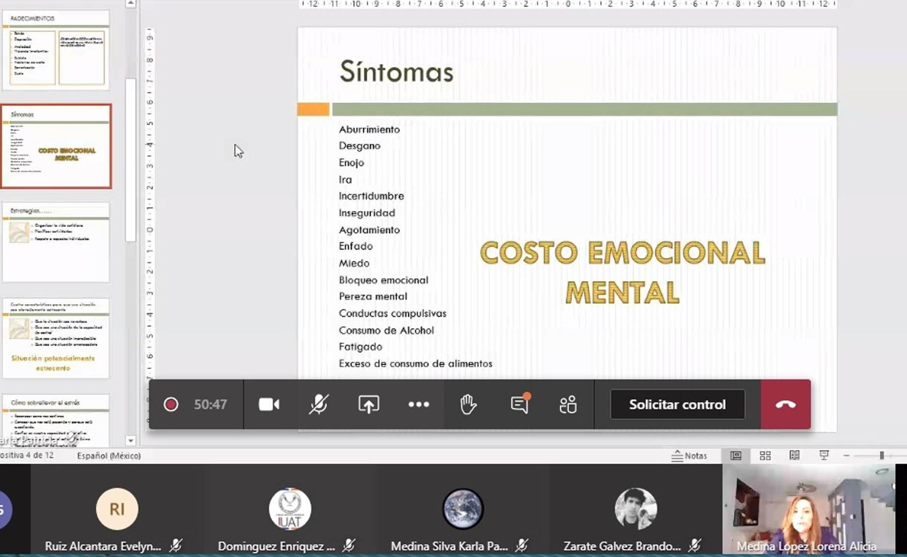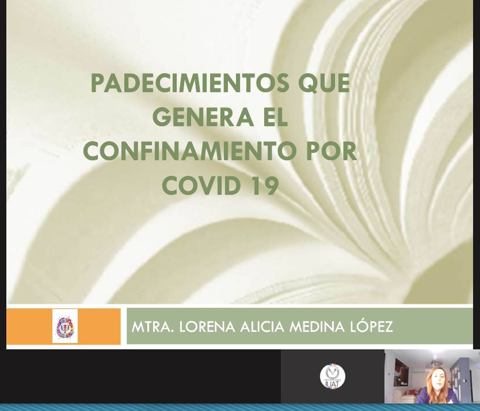Ante estudiantes de la carrera de Psicología de la FADYCS que siguieron el curso por la plataforma Teams, la ponente explicó los trastornos mentales que pueden presentarse por el confinamiento social, entre ellos, el estrés y la depresión.