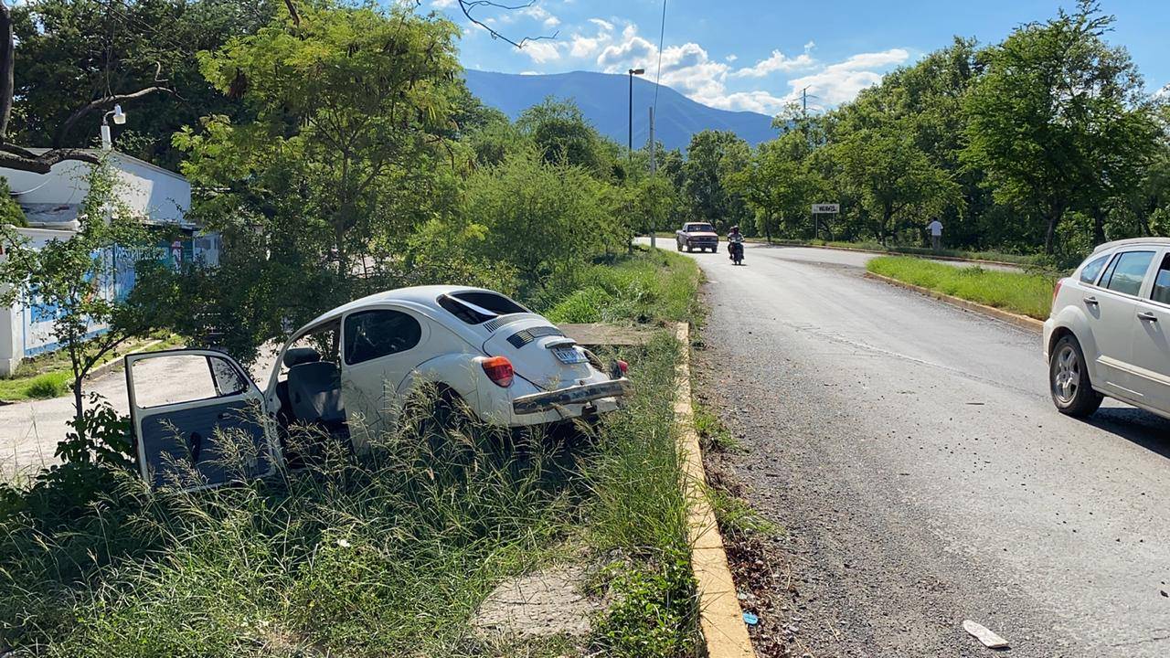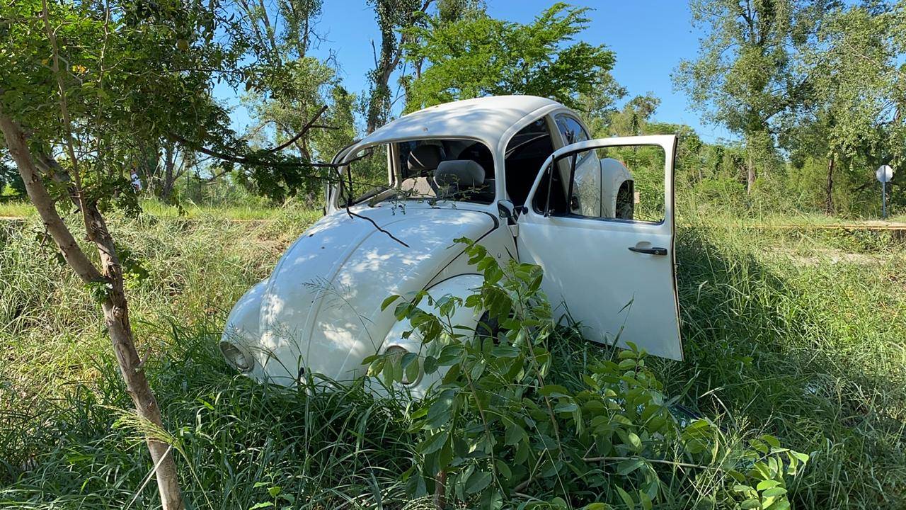 A la sombra de unos árboles, pero fuera del camino y a punto de volcar, un sujeto en presunto estado de ebriedad dejó abandonado su "vochito".