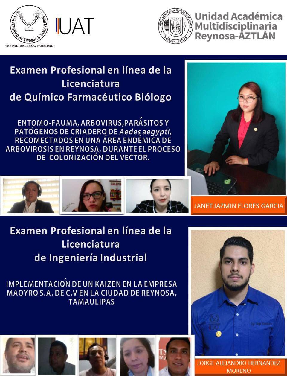 Atendiendo las medidas de sana distancia y protocolos sanitarios derivados de la contingencia por COVID-19, la Universidad Autónoma de Tamaulipas (UAT) ha modificado gran parte de sus actividades, y en este sentido, la Unidad Académica Multidisciplinaria Reynosa Aztlán (UAMRA) realizó exámenes de titulación por las plataformas virtuales, siendo Janet Jazmín Flores García y Jorge Alejandro Hernández Moreno, los primeros profesionales del plantel avalados vía remota.