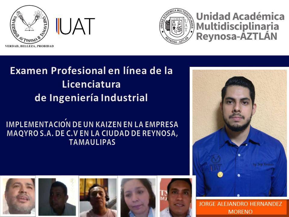 Hernández Moreno disertó ante un comité de titulación de tesis integrado por 3 profesores del Programa Educativo de Ingeniero Industrial, con el tema “Implementación de un Kaizen en la Empresa Maqyro S.A. de C.V. en la Ciudad de Reynosa, Tamaulipas”.