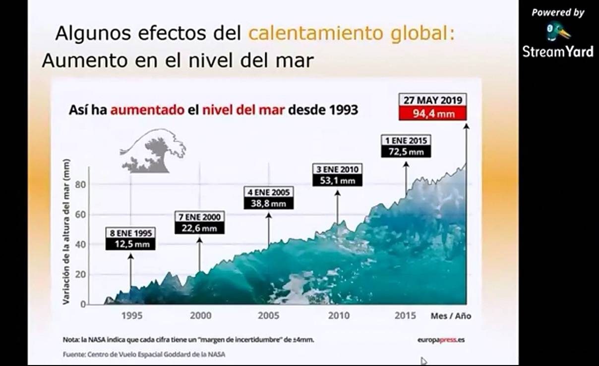 Agregó que con esto se empieza a ver un aumento del nivel del mar, pues hasta mayo de 2019, había 94.4 mm de elevación del mar, lo que genera alteraciones en el ciclo de producción de los alimentos, modificación del ciclo hidrológico, extinción de especies animales y vegetales, aumento de temperatura y la concentración de bióxido de carbono.