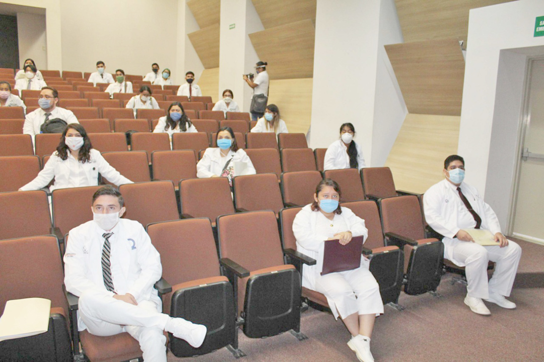 Atendiendo las medidas de sana distancia y prevención sanitaria que ha establecido el sector salud, los estudiantes del décimo semestre que concluyeron su formación académica en la Licenciatura de Médico Cirujano, acudieron en grupos reducidos a recibir el documento que es requerido para desarrollar su internado en los campos clínicos.