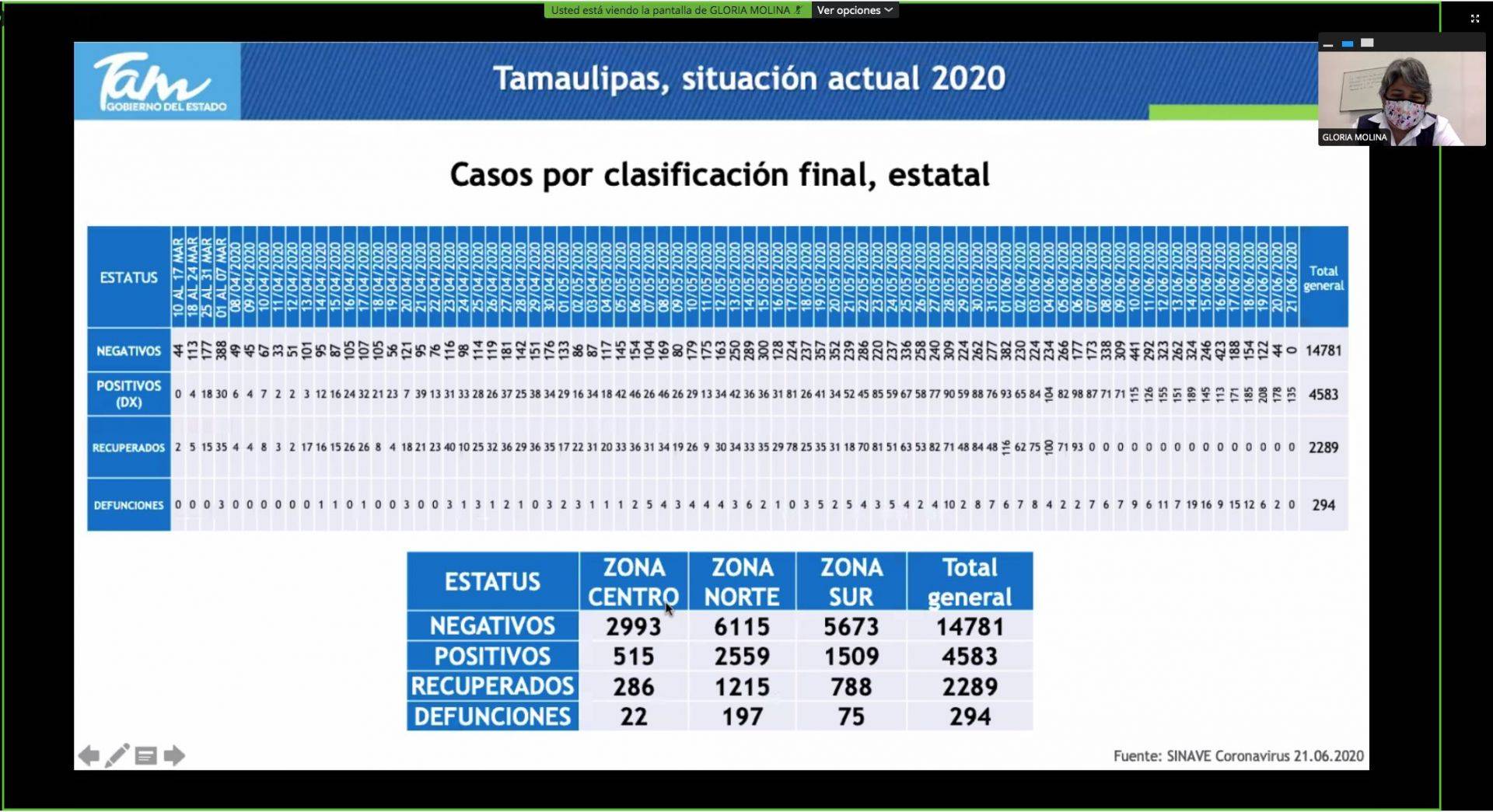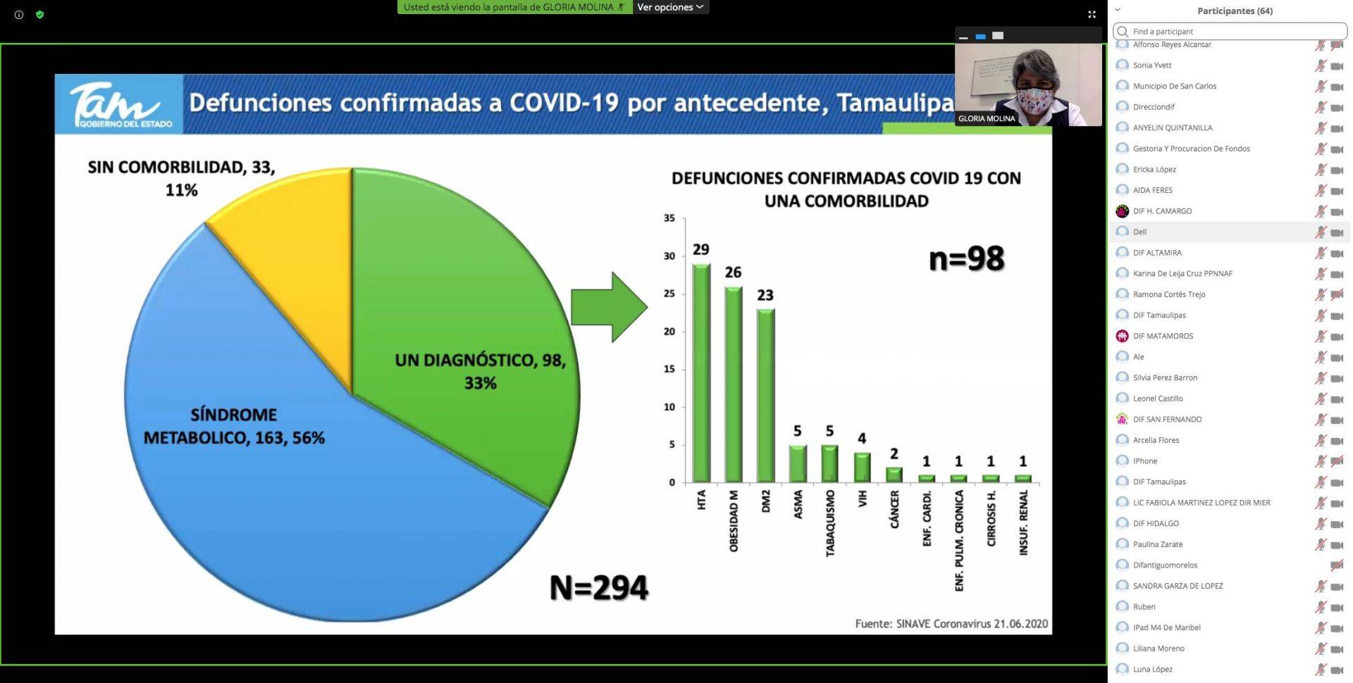También se contó con la participación de la Secretaría de Salud en el Estado Gloria de Jesús Molina Gamboa, quien actualizó a las presidentas y presidentes de los DIF Municipales sobre la situación que atraviesa Tamaulipas en la contingencia de COVID-19, haciendo un llamado a sumarse a las acciones de cuidado para evitar que siga en aumento el número de contagios de esta enfermedad.