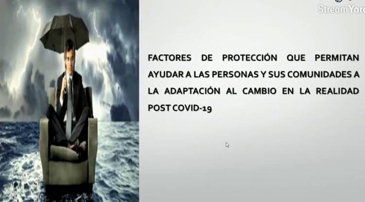 En su exposición abordó los escenarios actuales en la realidad durante y post Covid-19; los factores de protección que permitan ayudar a las personas y comunidades a la adaptación al cambio en la realidad post Covid-19; y propuestas para el bienestar social.
