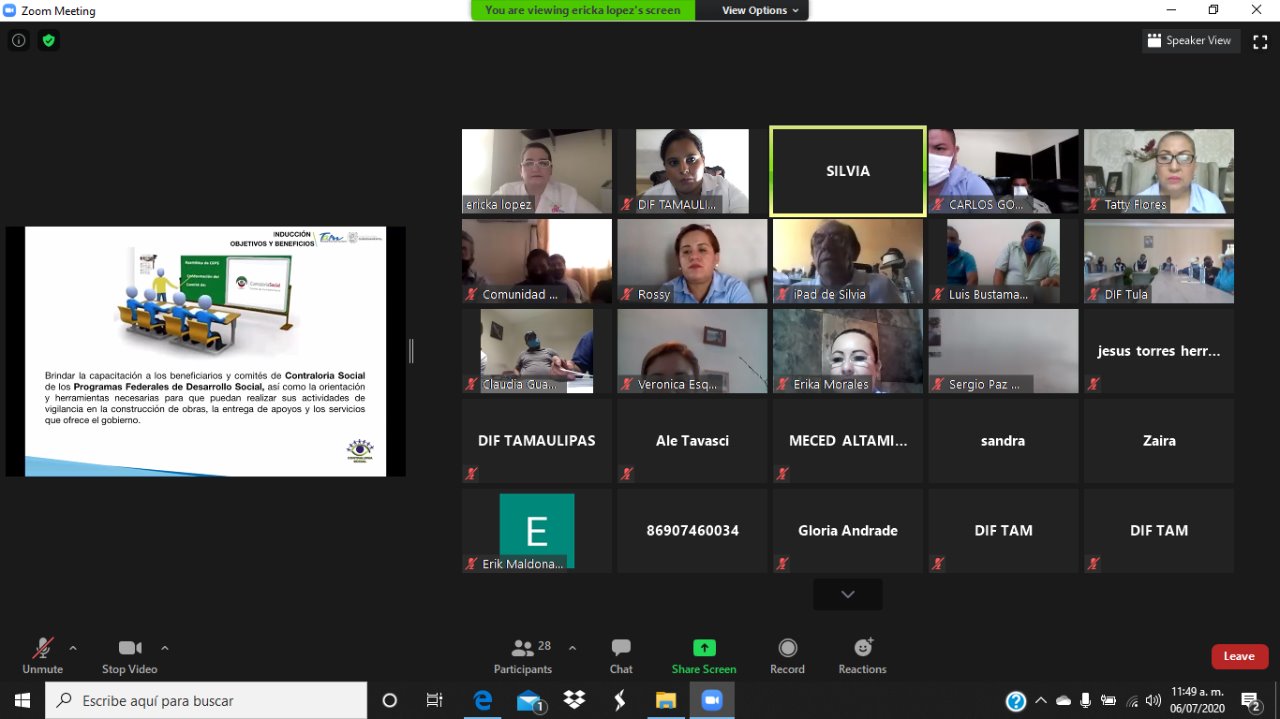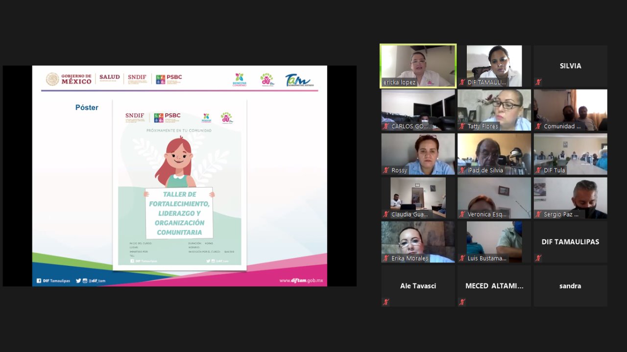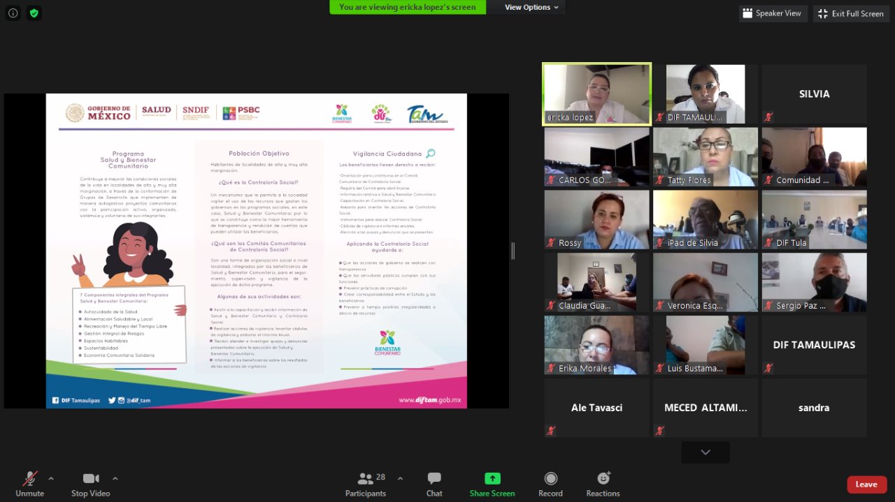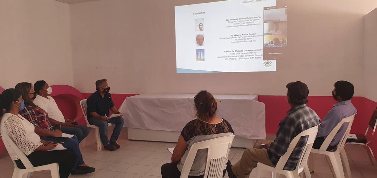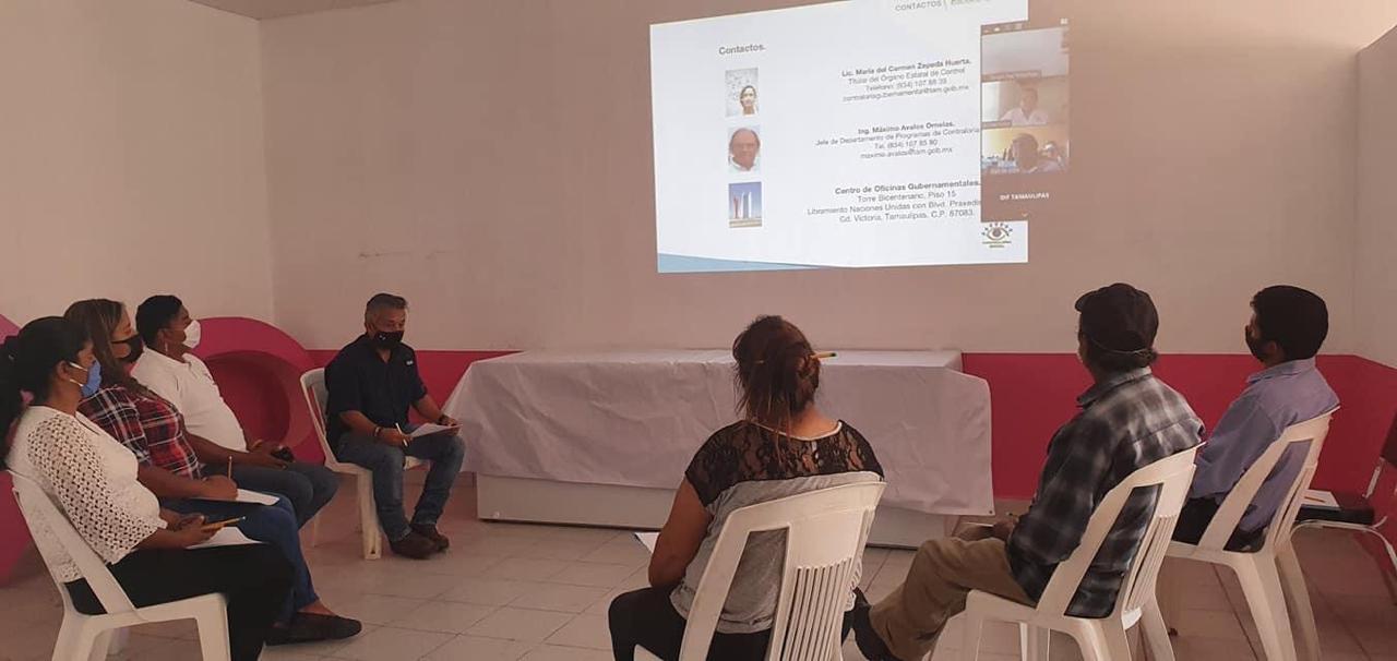 Con finalidad de capacitar a los integrantes de los comités de beneficiarios del programa Salud y Bienestar Comunitario que implementan el DIF Nacional y el DIF Tamaulipas en 29 comunidades rurales de la entidad, se llevó a cabo una videoconferencia con personal del órgano de Contraloría Gubernamental.