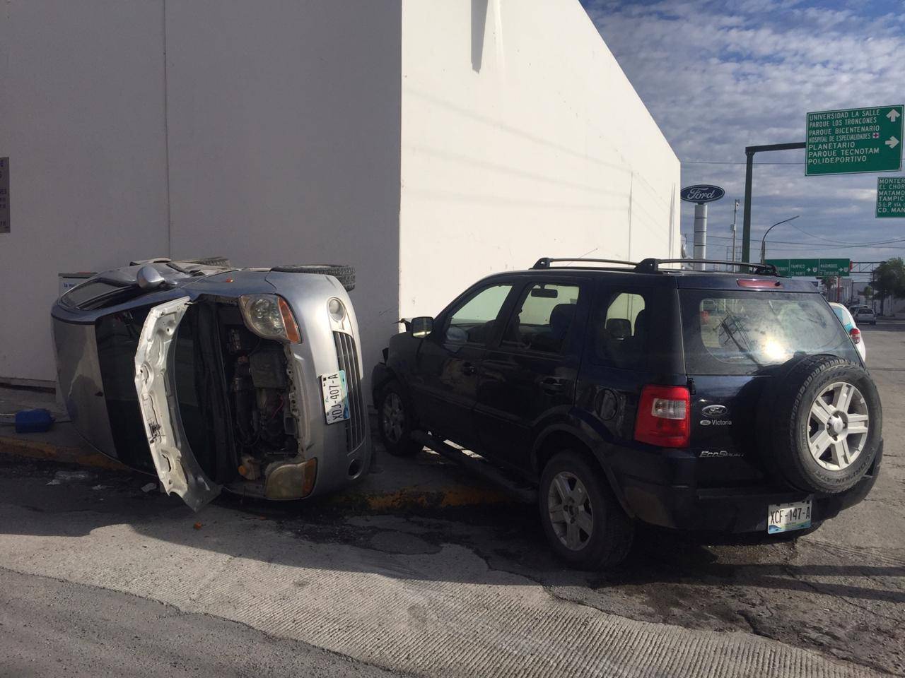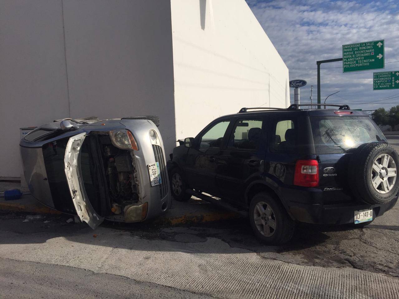 Mientras la camioneta Ecosport se impactó de manera frontal contra el inmueble, el automóvil Matiz después de chocar vuelca sobre uno de sus costados.
