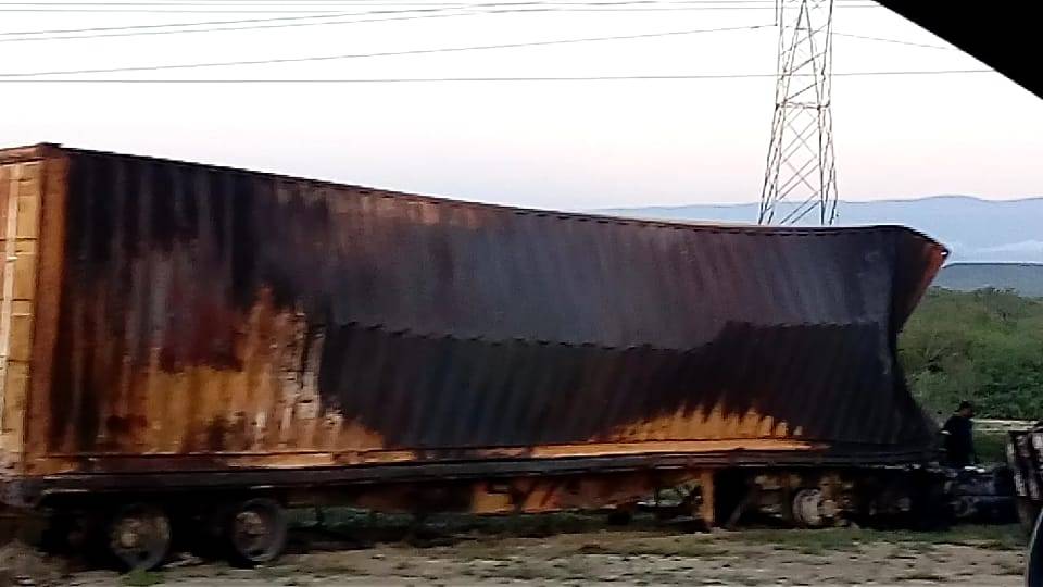 El accidente ocurrió cuando el operador de un tráiler Kenworth cargado con contenedores intentó rebasar y se estrelló contra la parte trasera de un tráiler con un contenedor cargado con melaza.