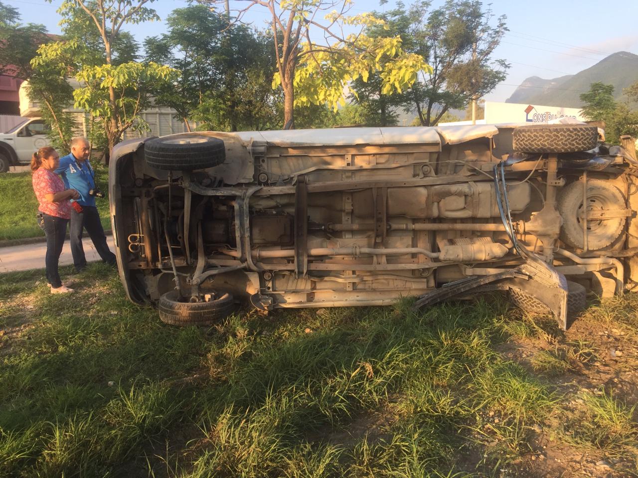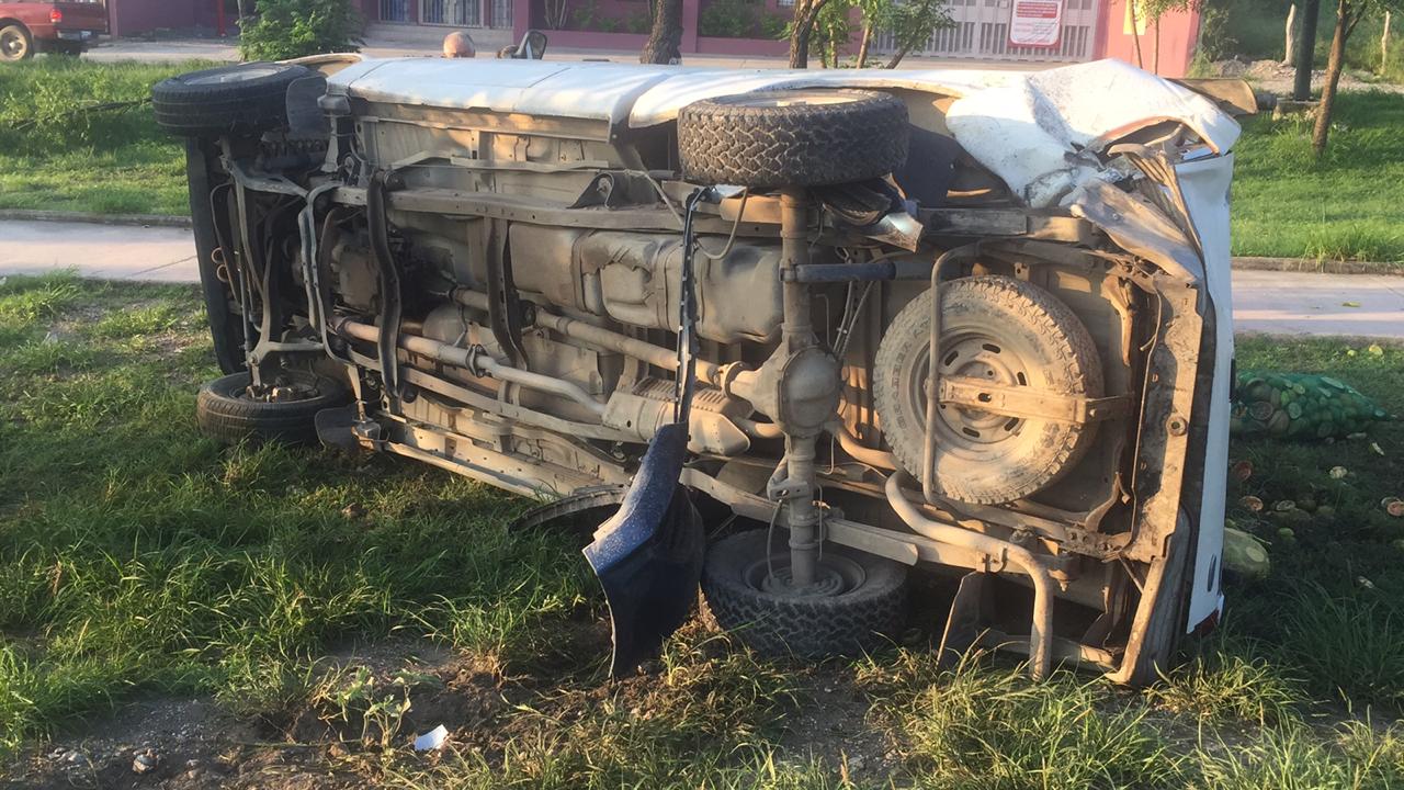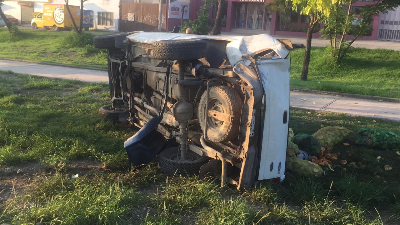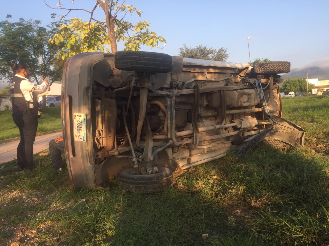 Al ser impactada por el vehículo Jetta la camioneta salió proyectada y abandonó la superficie de rodamiento vehicular para terminar volcada sobre el camellón divisor de carriles,