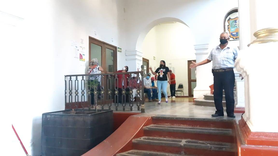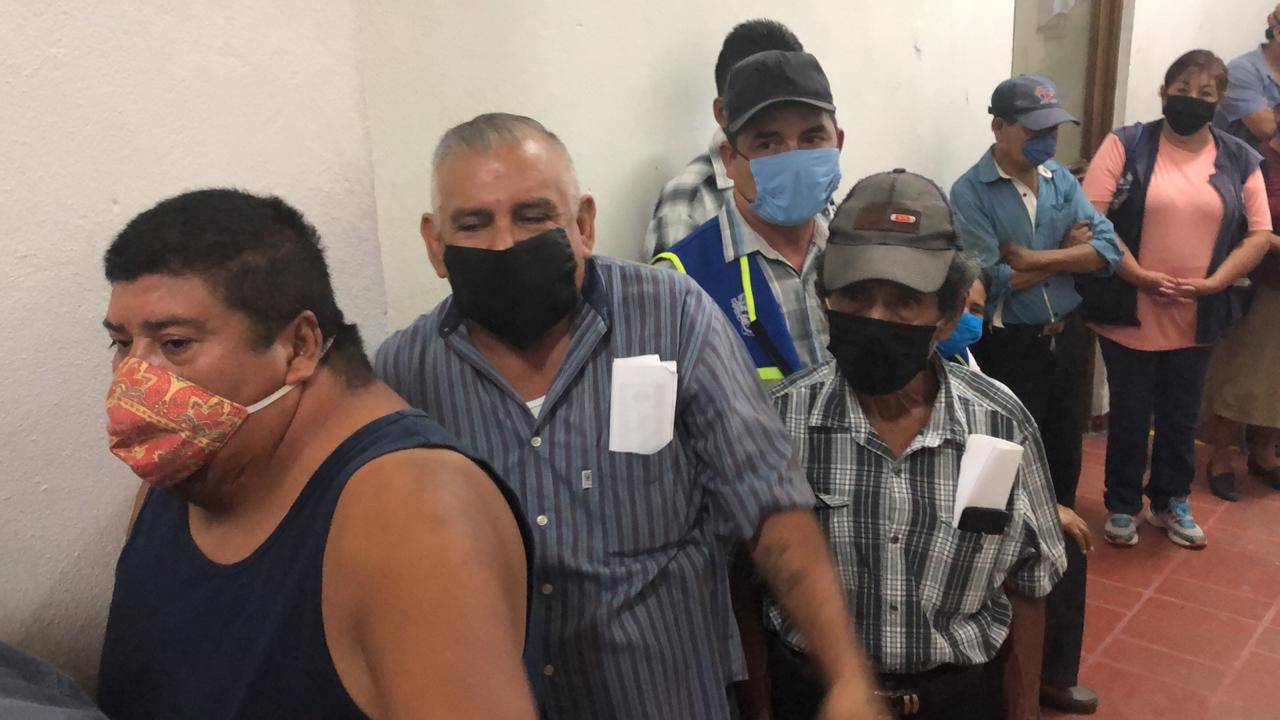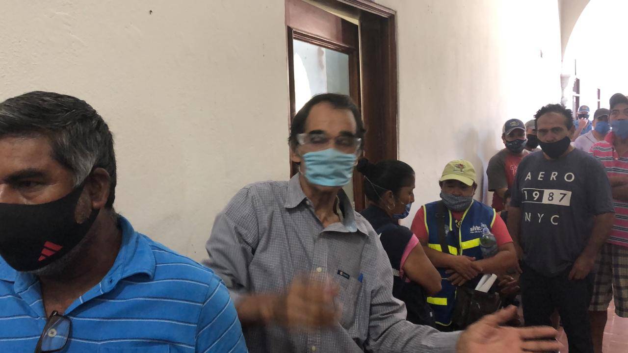 Mientras se encontraban haciendo dos filas y guardando las medidas correspondientes de sana distancia, personal de la Tesorería municipal los acomodó en una sola fila entorpeciendo el trabajo y amontonándolos sin respetar las medidas sanitarias correspondientes.