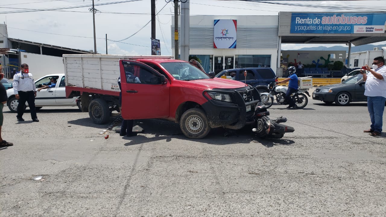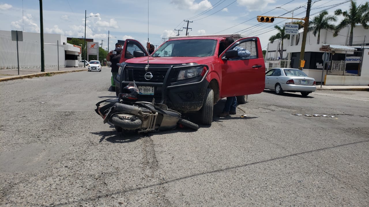 Un joven motociclista resultó lesionado después de ser impactado por una camioneta que se atravesó a su paso cuando circulaba por la calle Alberto Carrera Torres.