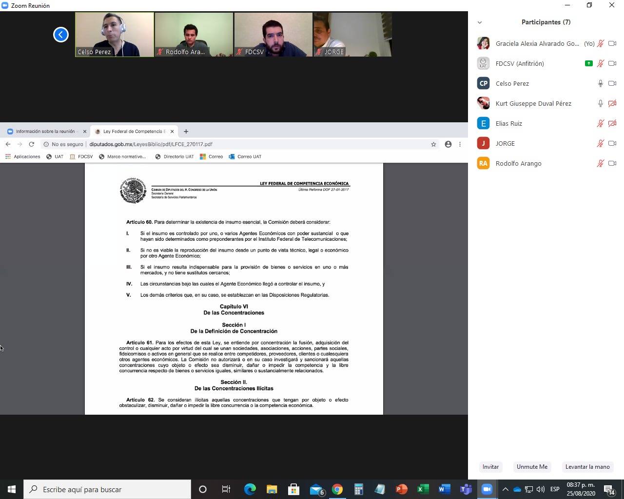 Este martes 25 de agosto, de 8 a 9:30 pm, se celebró la 8ª reunión virtual del equipo 'Correcaminos' Moot Comp 2020, compuesto por estudiantes de las Facultades de Derecho y Comercio de ciudad Victoria, de la Universidad Autónoma de Tamaulipas (UAT).