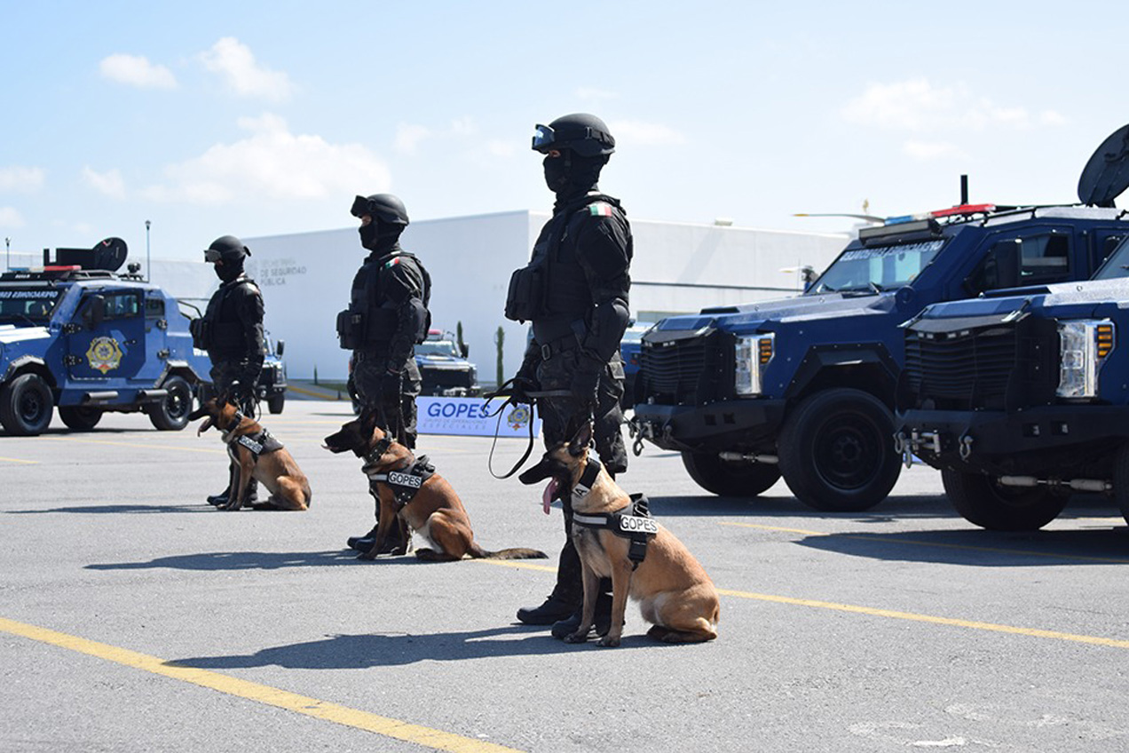 Además, participan binomios caninos para la detección de drogas, armas, papel moneda y explosivos, así como para hacer labores de rastreo, guardia y protección, teniendo a su disposición 25 vehículos blindados.