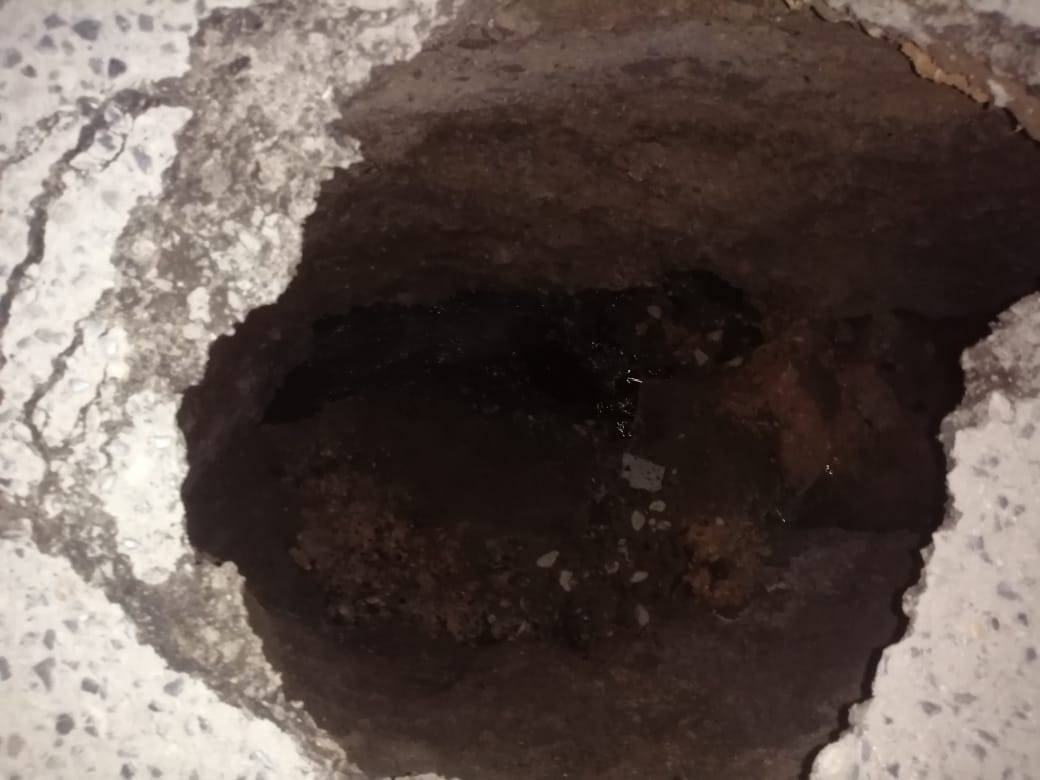 Fue el colapso de la red de drenaje lo que ocasionó que esta tarde se desplomara una parte de la carpeta asfáltica sobre la calle Pamoranes de la colonia Revolución Verde, dejando un hoyo de aproximadamente un metro de diámetro sobre la superficie de rodamiento vehicular.