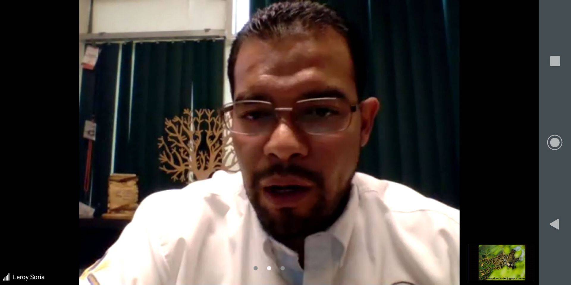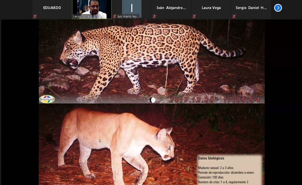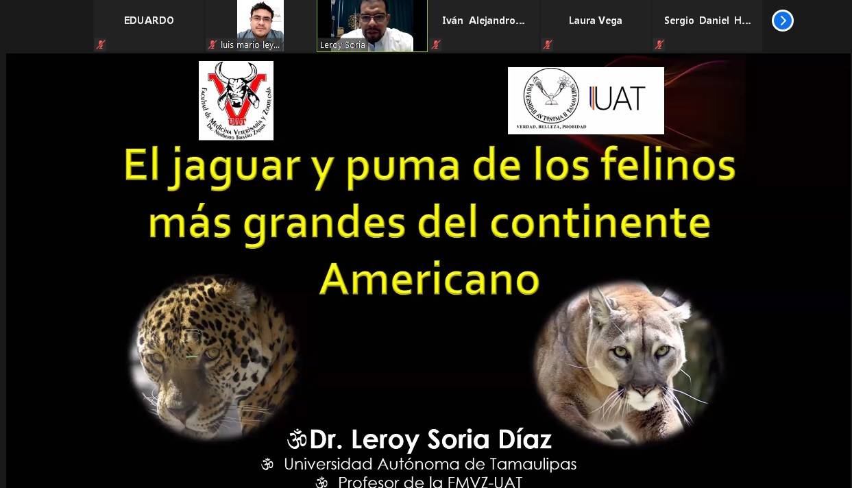 Al dictar la ponencia virtual “El jaguar y el puma de los felinos más grandes del continente”, en evento organizado por la Facultad de Medicina Veterinaria y Zootecnia (FMVZ), el investigador del Instituto de Ecología Aplicada (IEA) de la UAT refirió el trabajo que ha desarrollado la universidad para contribuir a mantener las poblaciones de jaguar y puma, destacando que se cuenta con un importante corredor biológico entre Tamaulipas y San Luís Potosí.