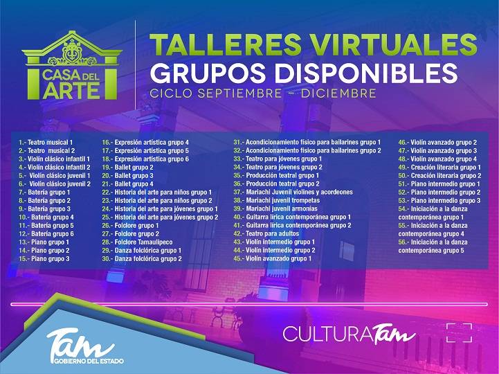 “La contingencia sanitaria derivada del COVID 19 ha vuelto imprescindible la búsqueda de nuevos lenguajes y estrategias que permitan a los niños, niñas y jóvenes vivir la etapa del aislamiento social con una perspectiva del arte y la creación que permita mitigar los efectos negativos del confinamiento que se nos ha requerido. Por tal motivo y conscientes del desafío para las familias, Cultura Tamaulipas ofrece por primera vez su oferta académica totalmente gratuita con el que 621 alumnos de todo el estado dieron inicio a talleres con contenidos adaptados para atender a 93 grupos desde las distintas disciplinas artísticas y bajo la tutela de 21 maestros”, comentó la titular de dicha dependencia.