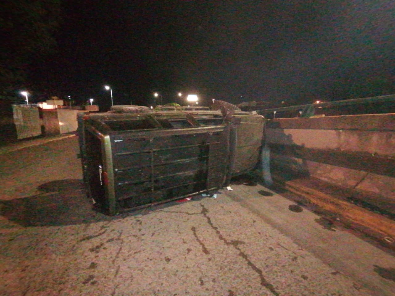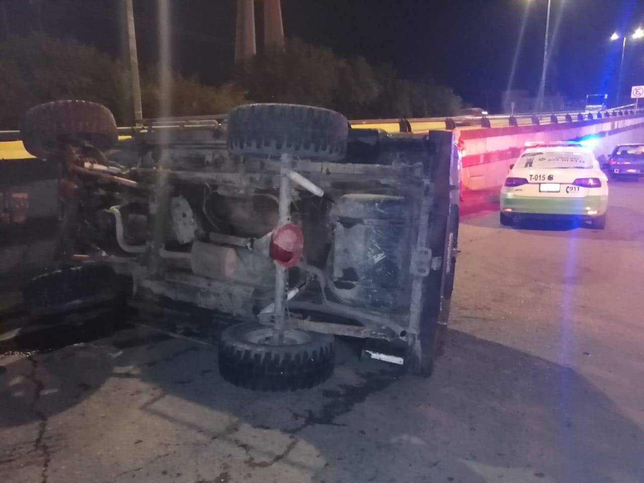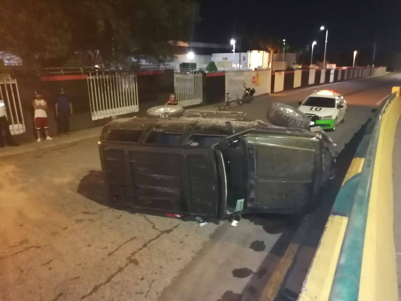 Tras chocar contra el muro de concreto la camioneta Cherokee quedó fuera de control y terminó volcada sobre su costado derecho en el carril lateral del Bulevar Adolfo López Mateos a un costado de la "Joroba".