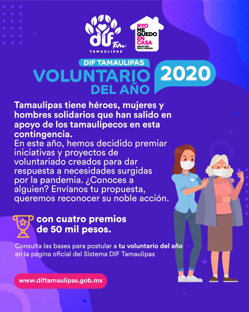 Para mayores informes pueden comunicarse vía telefónica a la Subdirección de Enlace Voluntariado al (834) 318 1436 y 318 1437 y en el enlace http://www.diftamaulipas.gob.mx/convocatorias/reconocimiento-al-voluntario-2020/ podrán descargar los documentos oficiales y consultar las bases de la convocatoria.