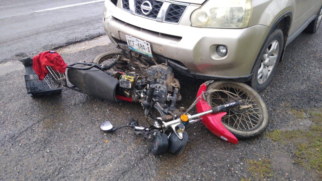 El conductor de la motocicleta, un menor de 16 años de edad, al salir del camino de terracería en sentido de oriente a poniente intenta incorporarse a la carretera en sentido de norte a sur sin tomar las debidas precauciones y es impactado por una camioneta marca Nissan tipo XTrail.