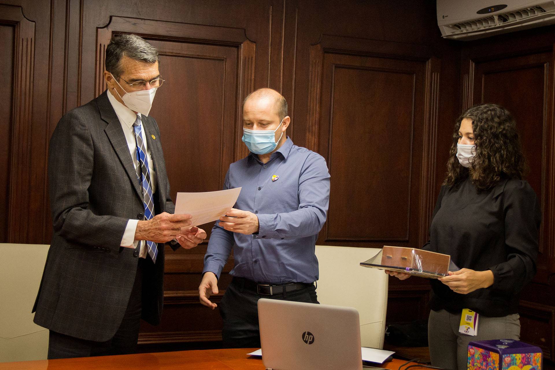 En reunión celebrada en esta capital, el Rector de la UAT, Ing. José Andrés Suárez Fernández, recibió el reconocimiento por parte del Director General del CRIT-Tamaulipas, Ing. Baldomero López Zamora, quien destacó su agradecimiento a la Universidad por apoyar el crecimiento de este organismo en la entidad.
