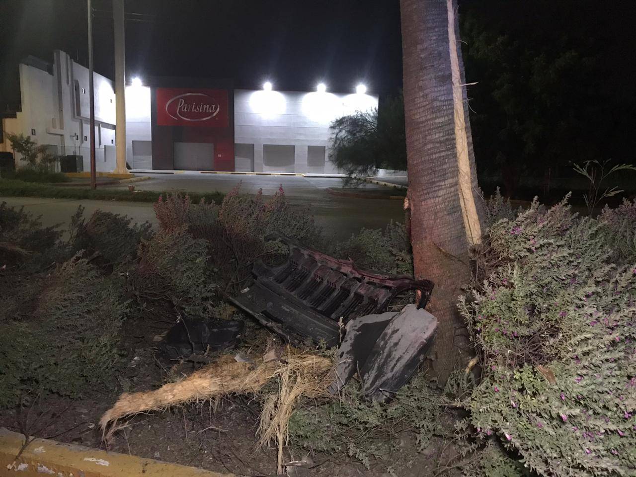 Después de chocar contra los dos palmeras, la camioneta salió proyectada y terminó sobre la banqueta del lado poniente del bulevar Tamaulipas a punto de caer a un dren pluvial.