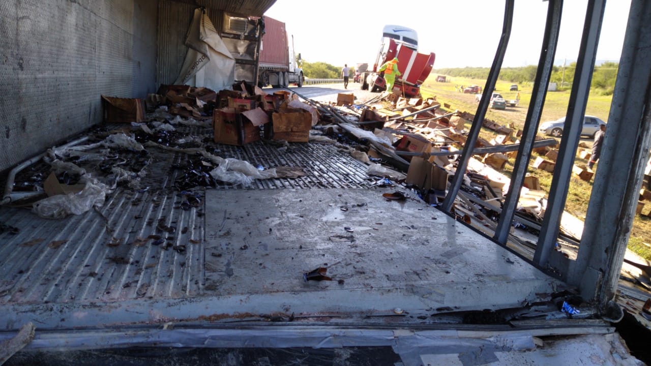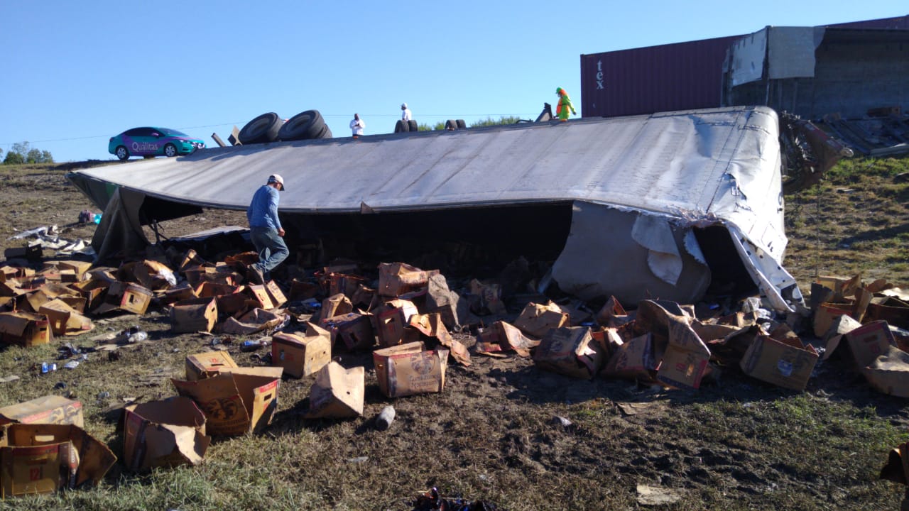 Tras el accidente, en el lugar quedó volcado un tráiler doble remolque marca Kenworth cargado con alrededor de 60 toneladas de cerveza.