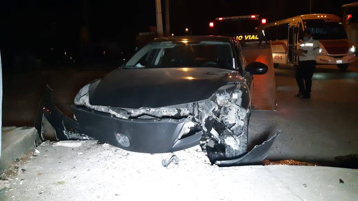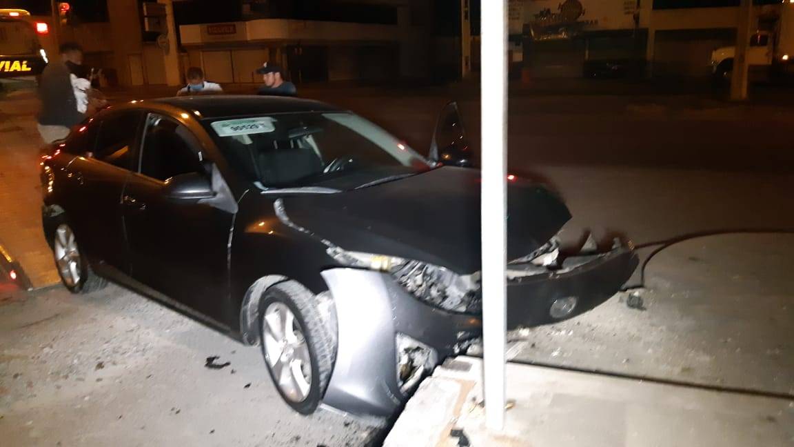 Debido a la velocidad con que era tripulado el vehículo Mazda derrapó y al salir proyectado hacia su lado derecho se estrella contra el cordón de una banqueta.