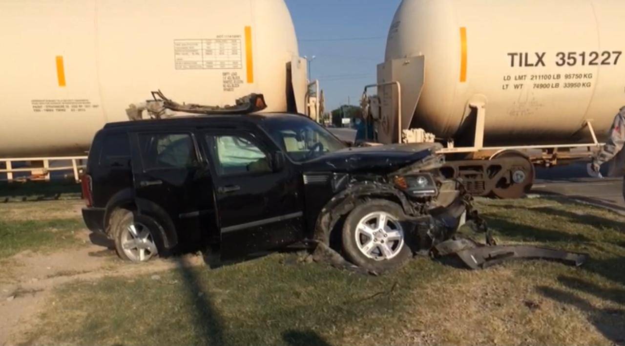 Una camioneta quedó completamente destrozada de la parte frontal cuando su conductor trató de ganarle el paso al tren.