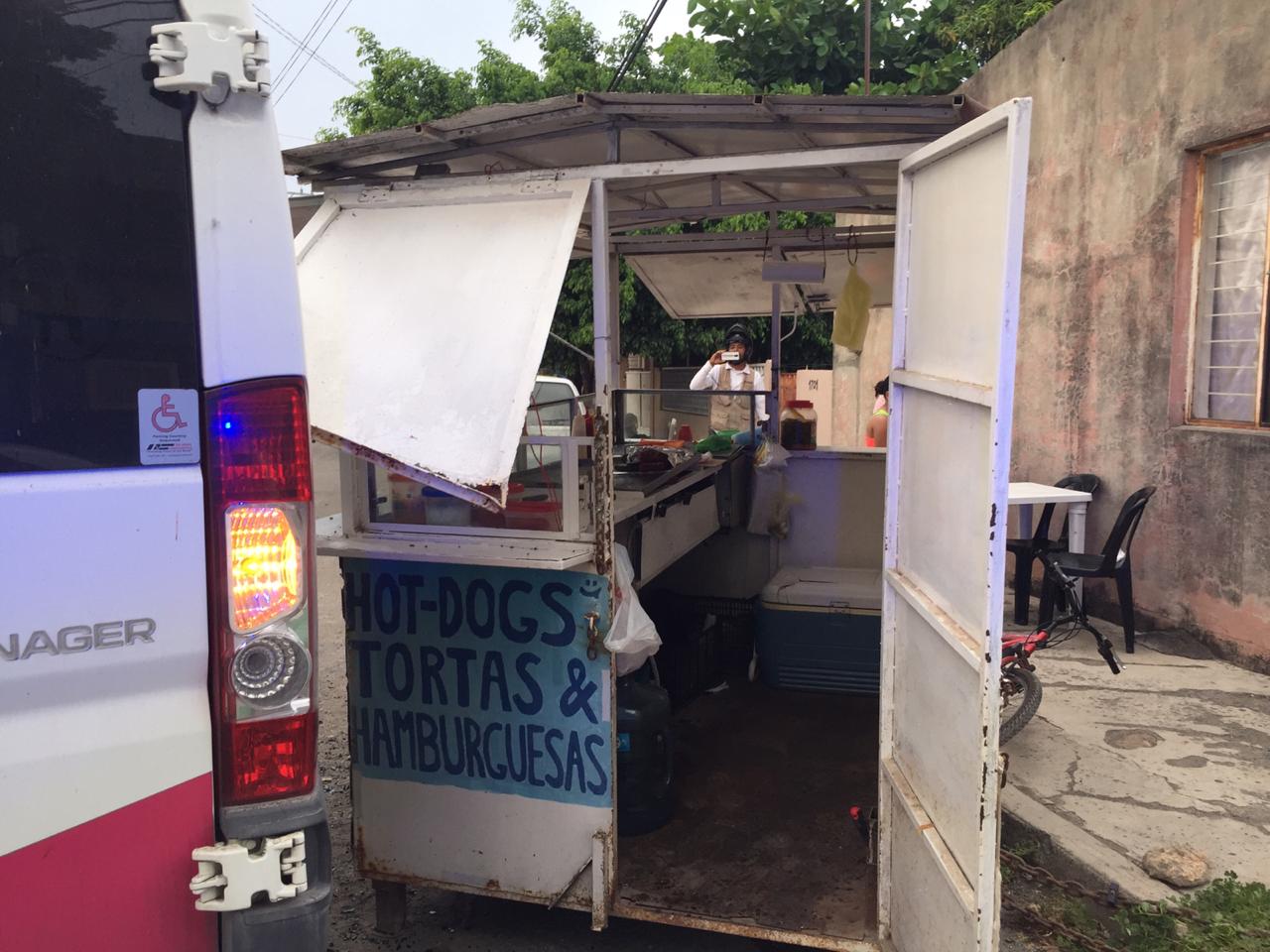 Cuando se encontraba dorando salchichas en un carretón de venta de hot dogs y hamburguesas, un comerciante sufrió un susto cuando una camioneta tipo Van se estrelló contra el puesto de comida rápida.