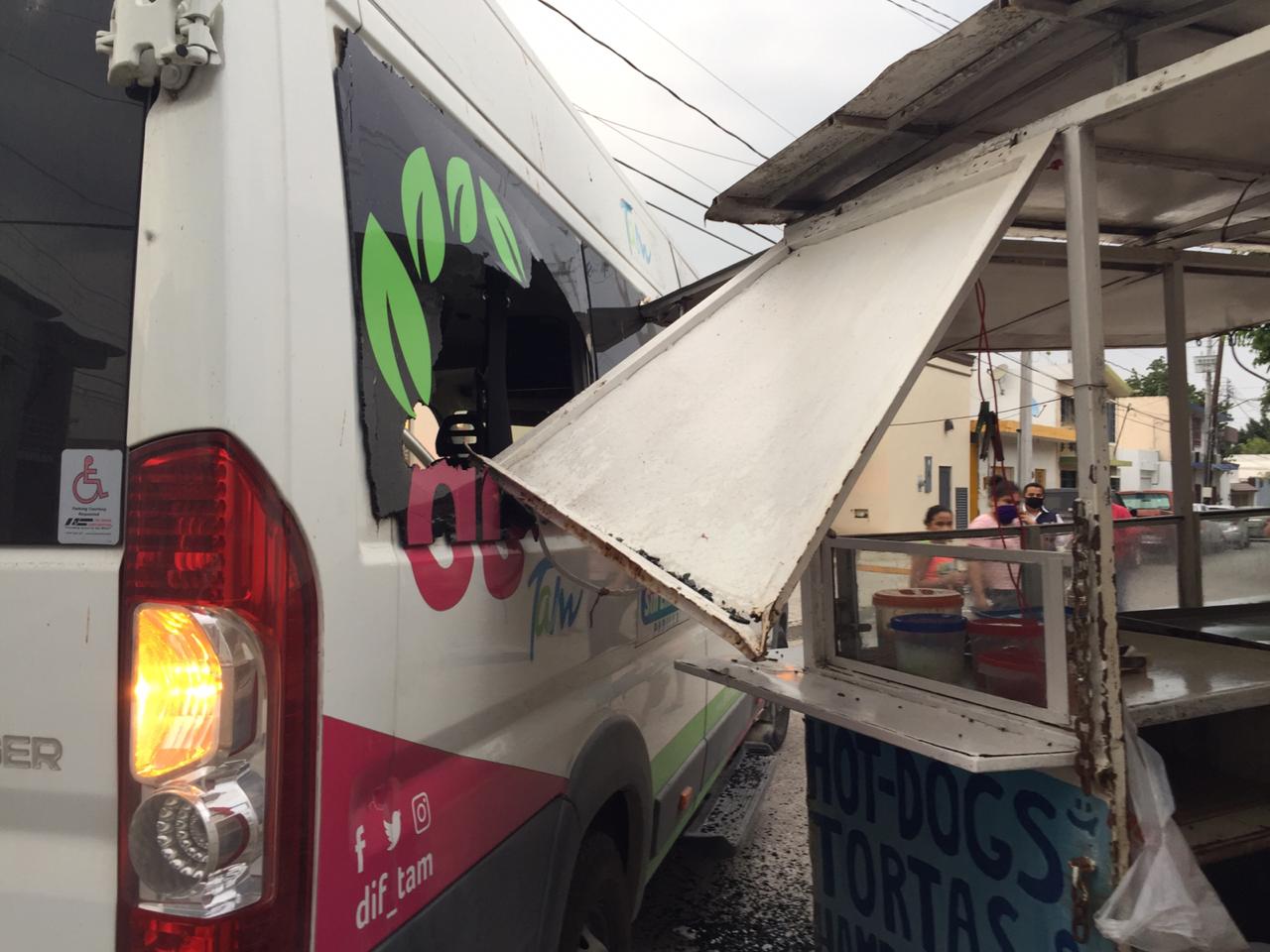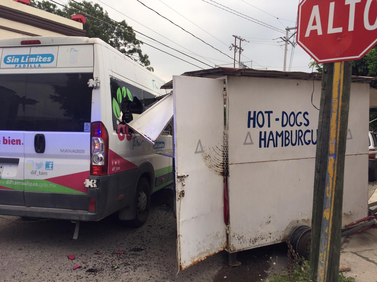 Al llegar a la esquina con la calle Uno el conductor de la camioneta Van da vuelta y se estrella contra el carretón dedicado a la venta de hot dogs y hamburguesas.