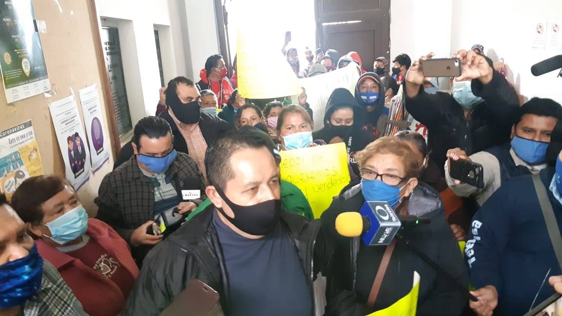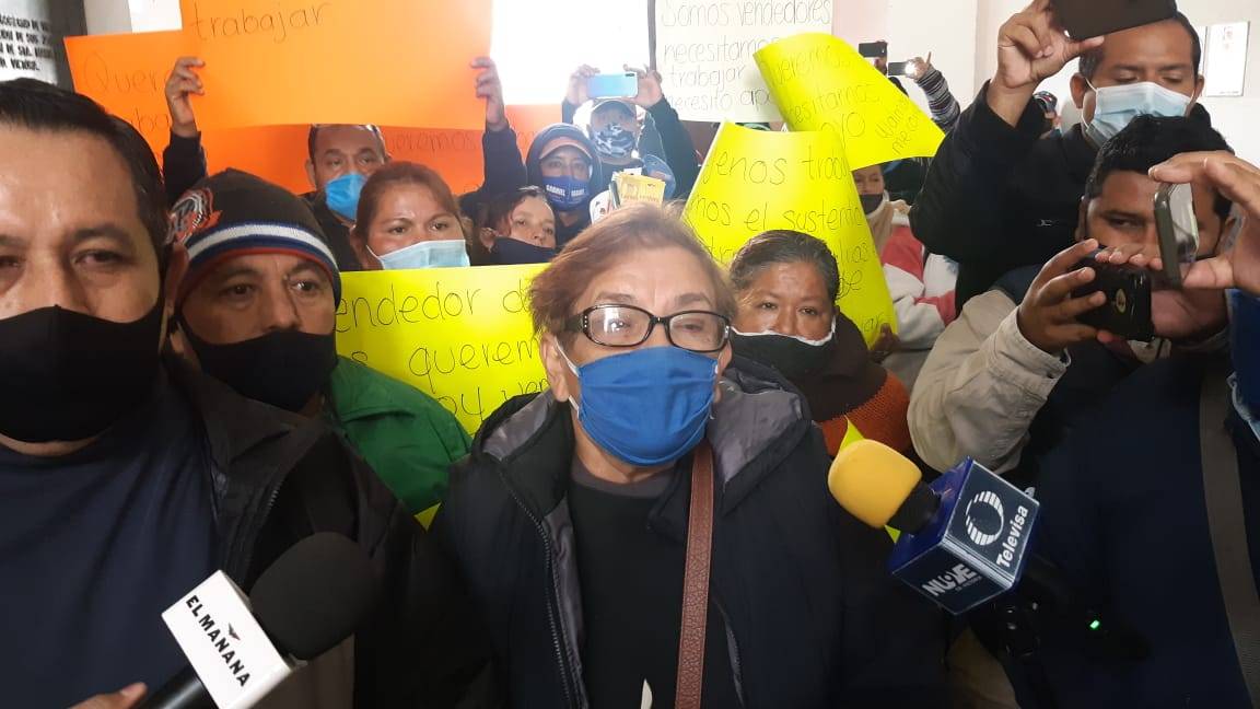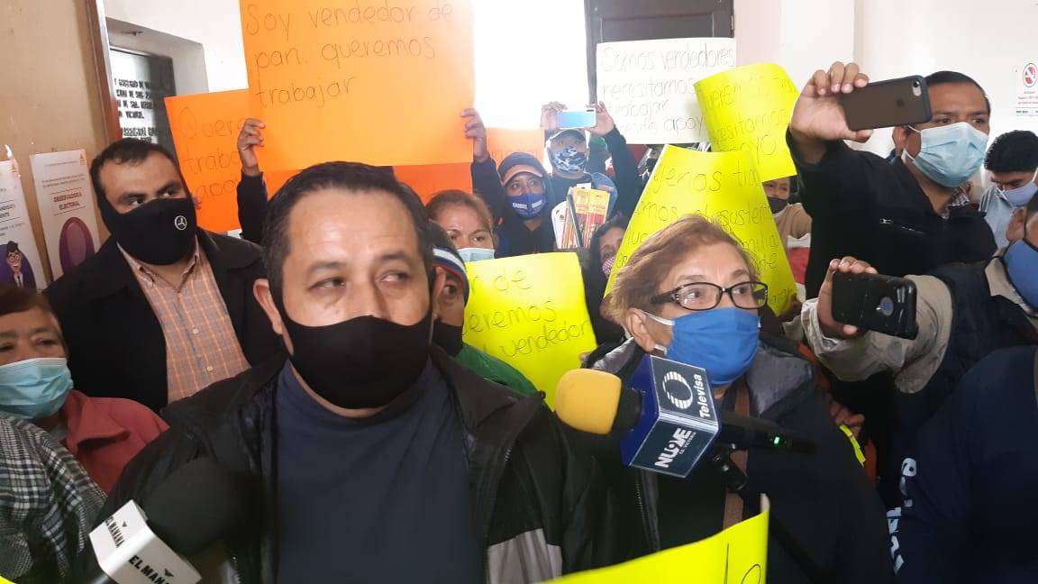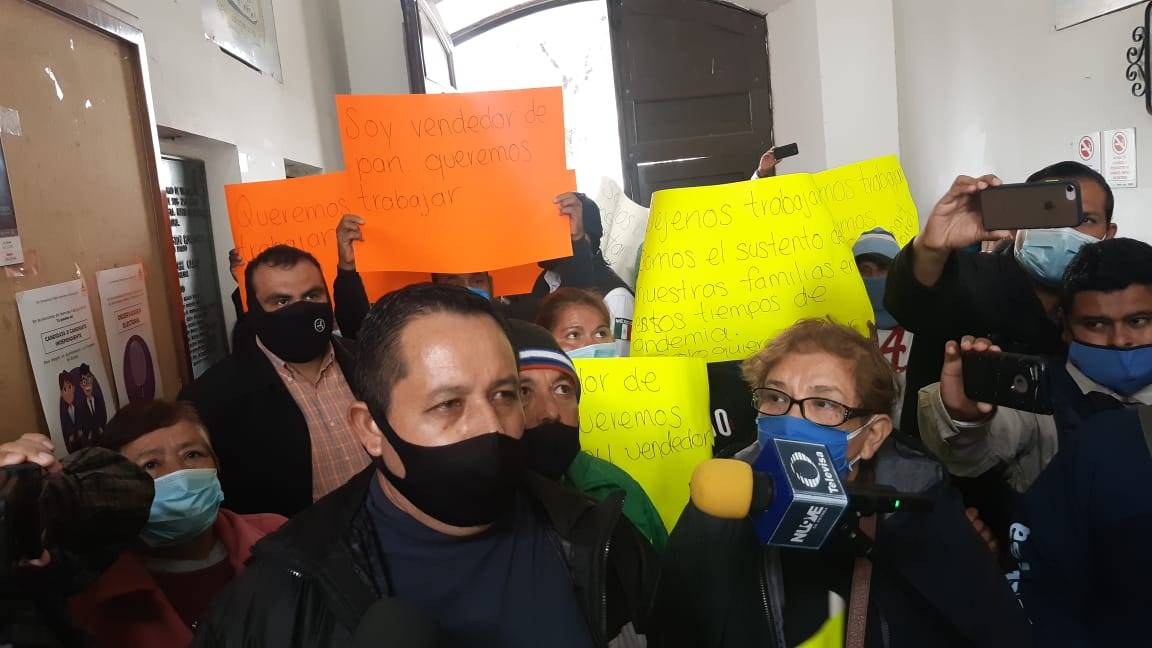 Con mensajes como "Dejenos trabajar", "Somos el sustento de nuestras familias", "Soy vendedor de pan", "Queremos apoyo", el grupo de vendedores llegó a la Presidencia Municipal para buscar un encuentro con funcionarios del Ayuntamiento.